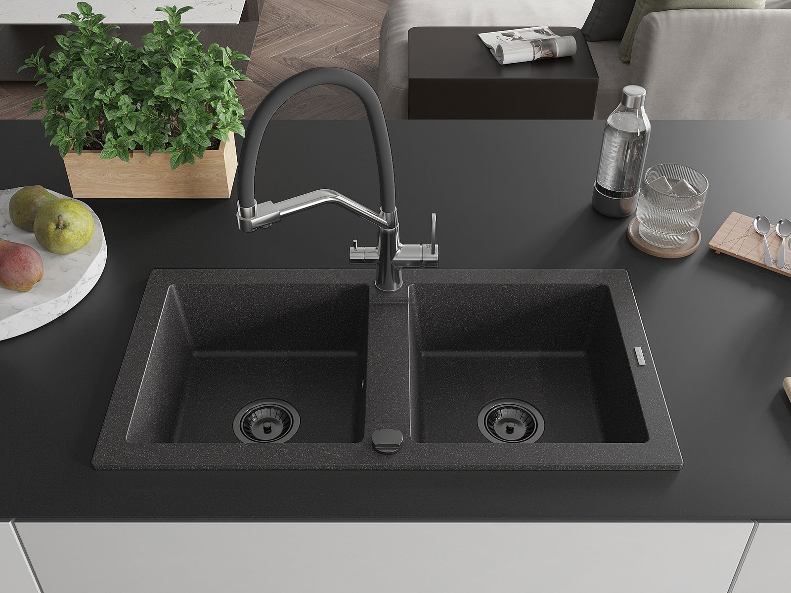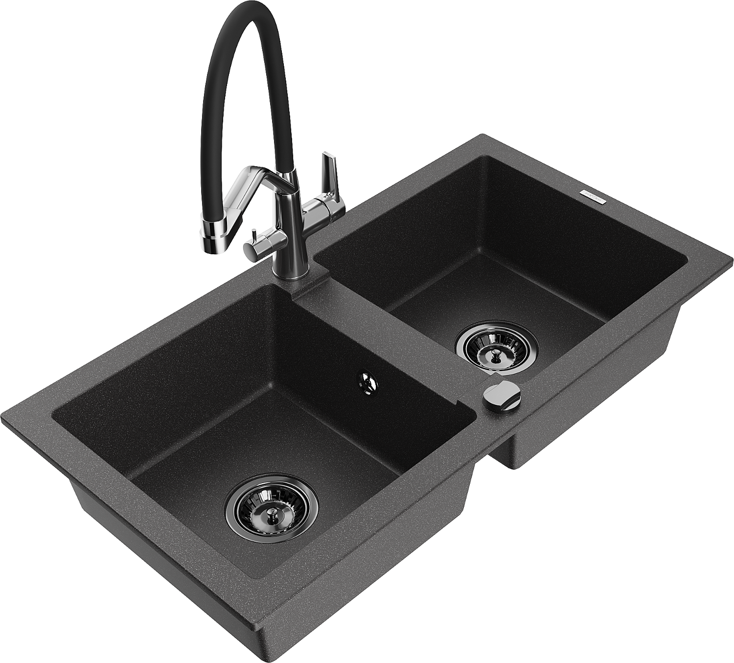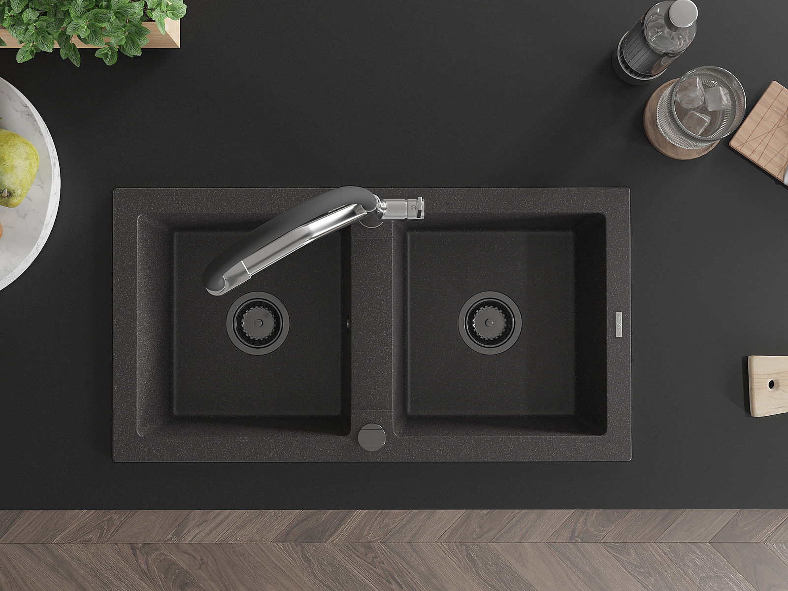 Mexen Mario granito virtuvės kriauklė su dviem kameromis ir virtuvės maišytuvu Duo, juoda su taškuota - 6504-76-671701-07-B