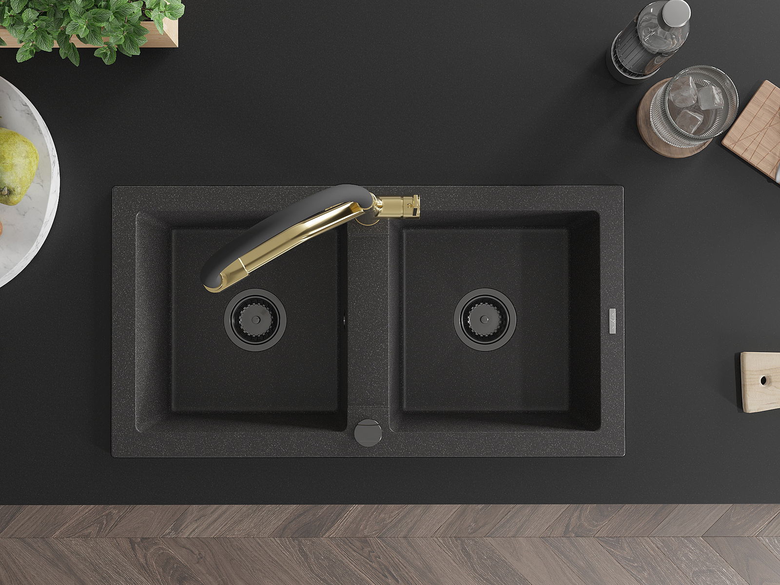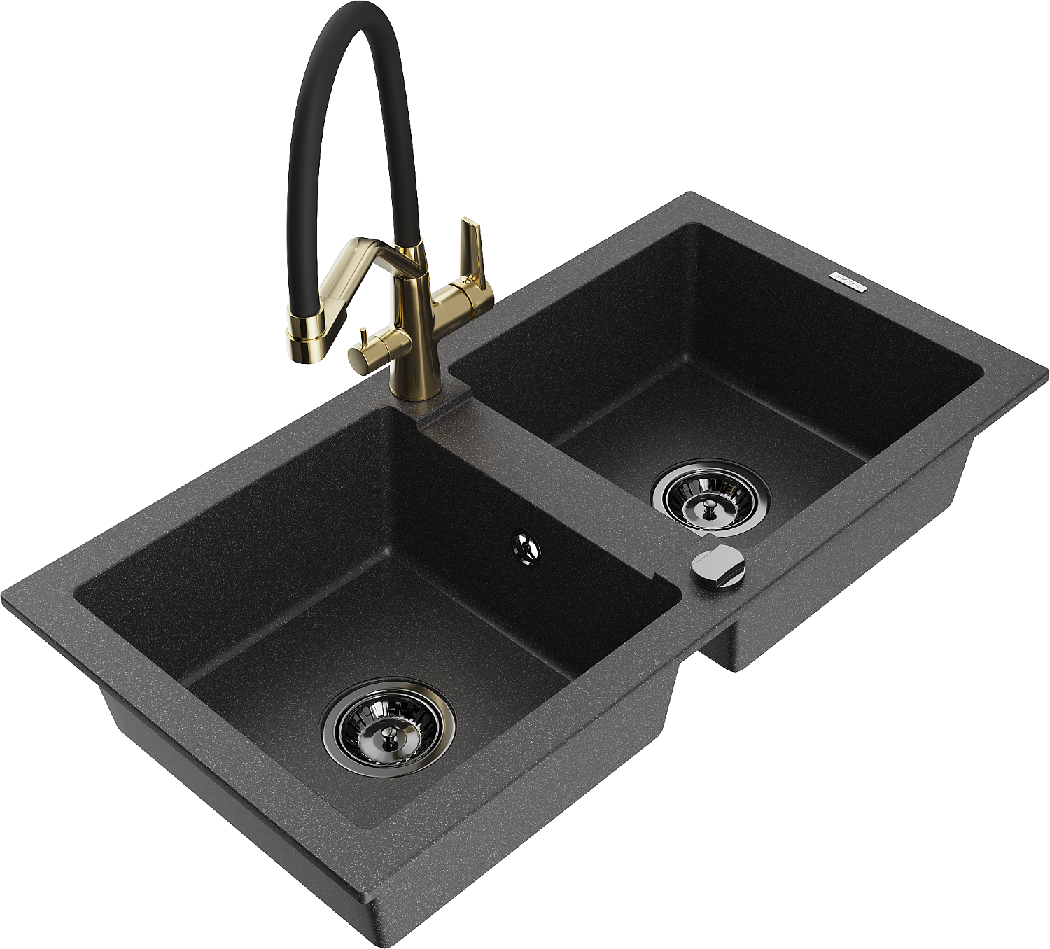 Mexen Mario granito dviejų kamerų plautuvė su Duo virtuviniu maišytuvu, juoda marginta - 6504-76-671701-57-B