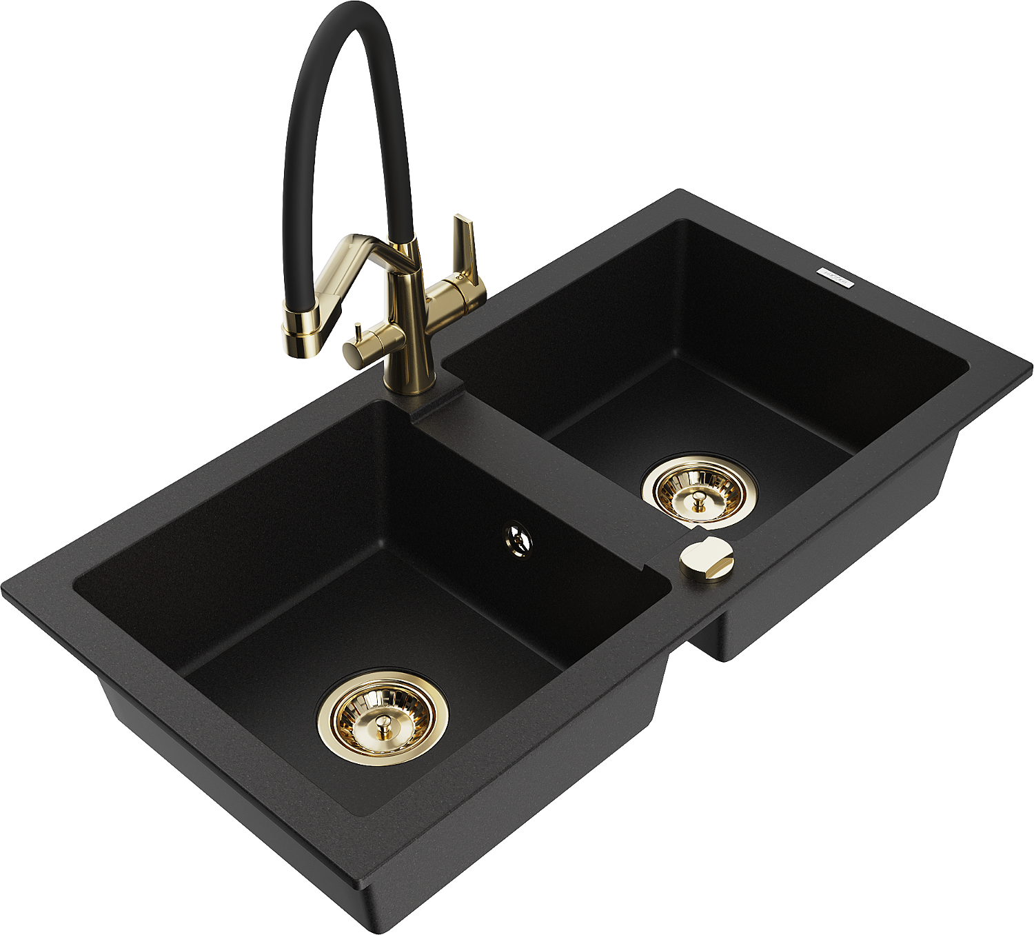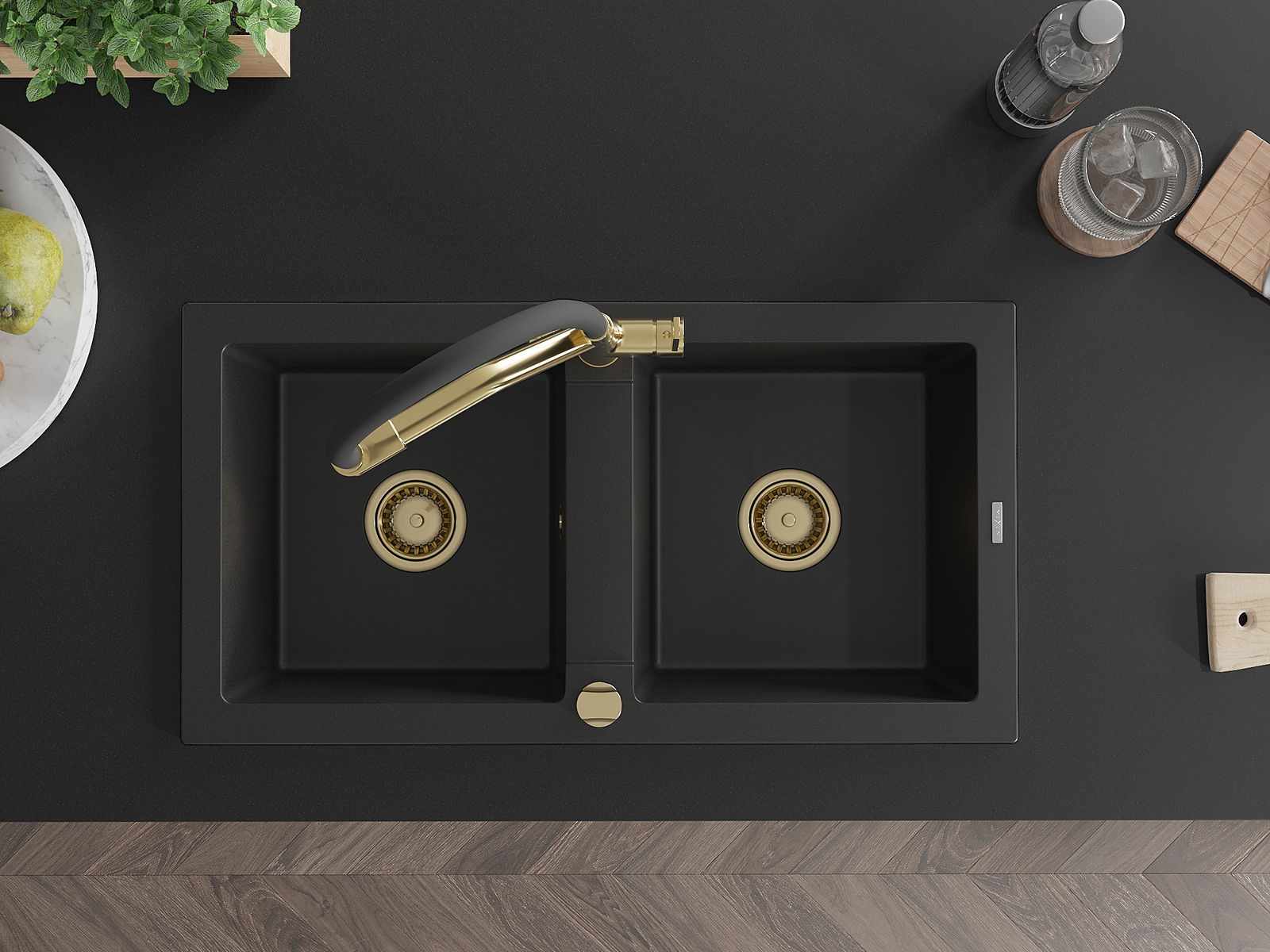 Mexen Mario granito virtuvės dviejų kamerų kriauklė su virtuves maišytuvu Duo, juoda - 6504-77-671701-57-G