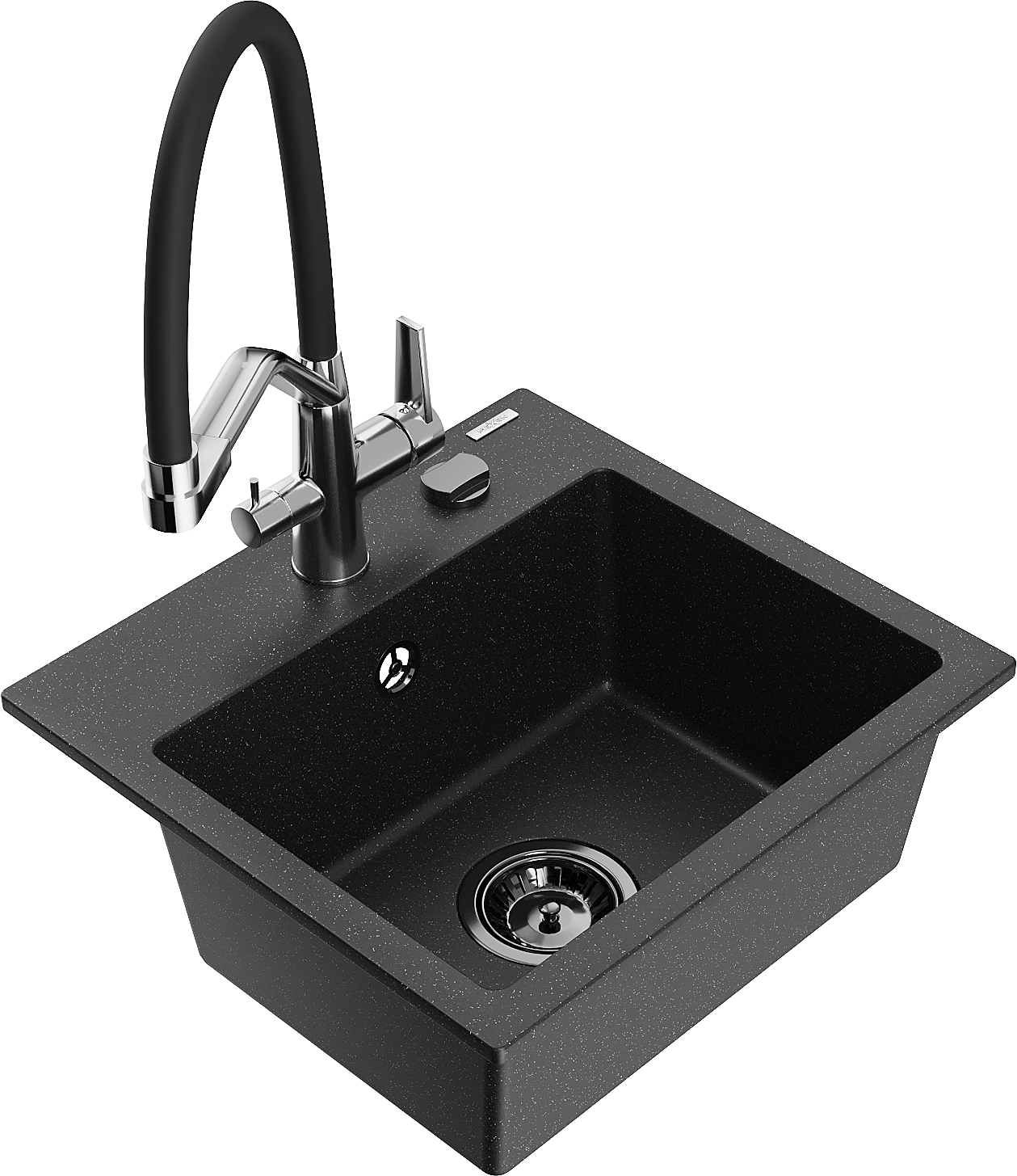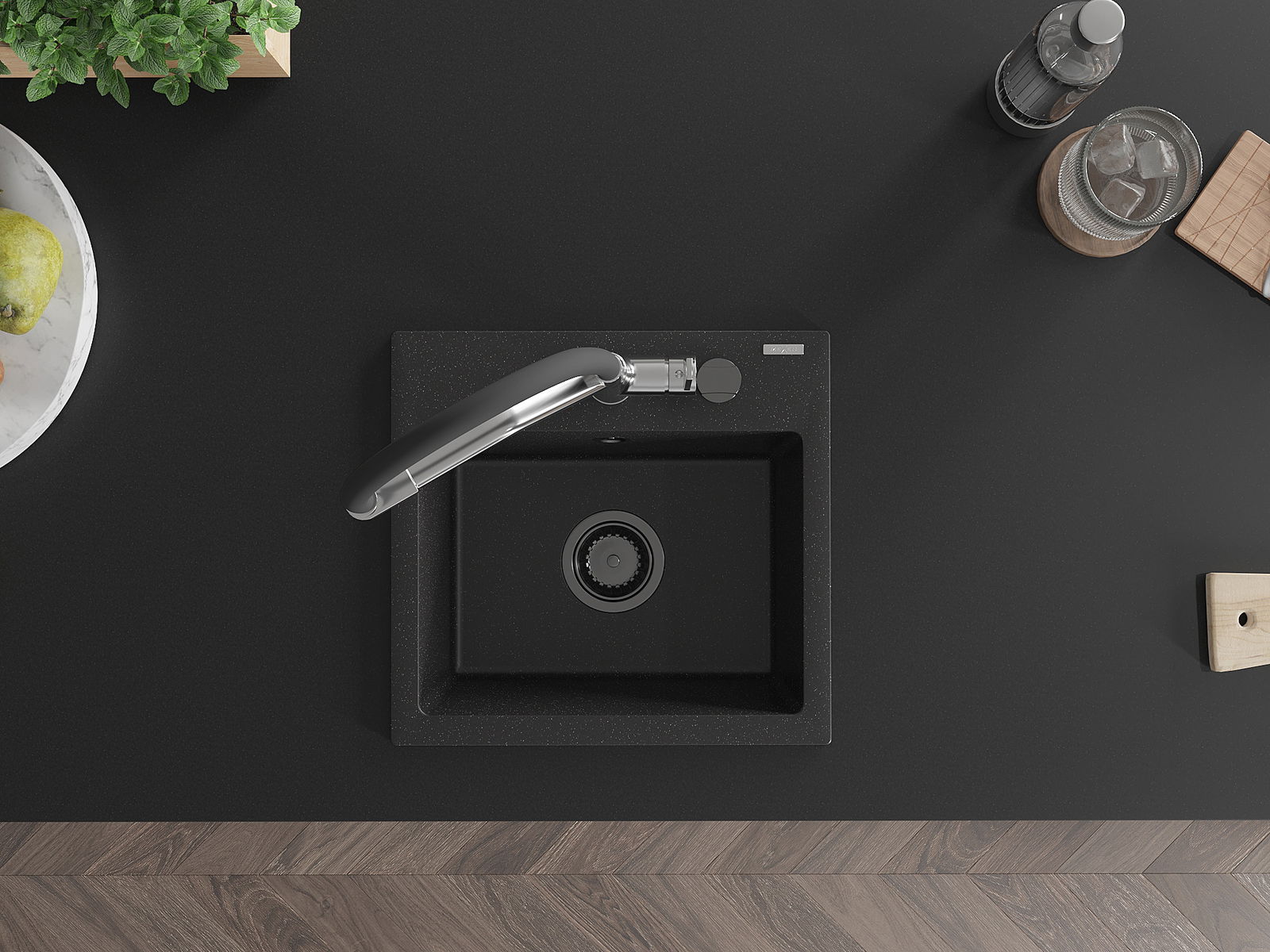 Mexen Milo granitinė vienos kameros kriauklė su virtuviniu maišytuvu Duo, juodas/sidabrinis metalikas - 6505-73-671701-07-B