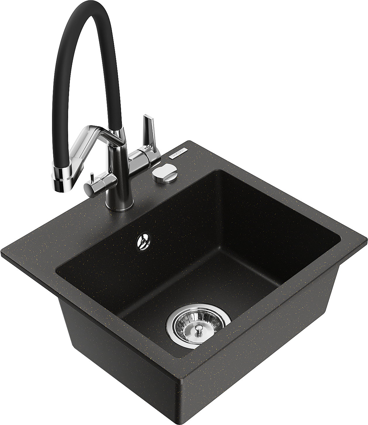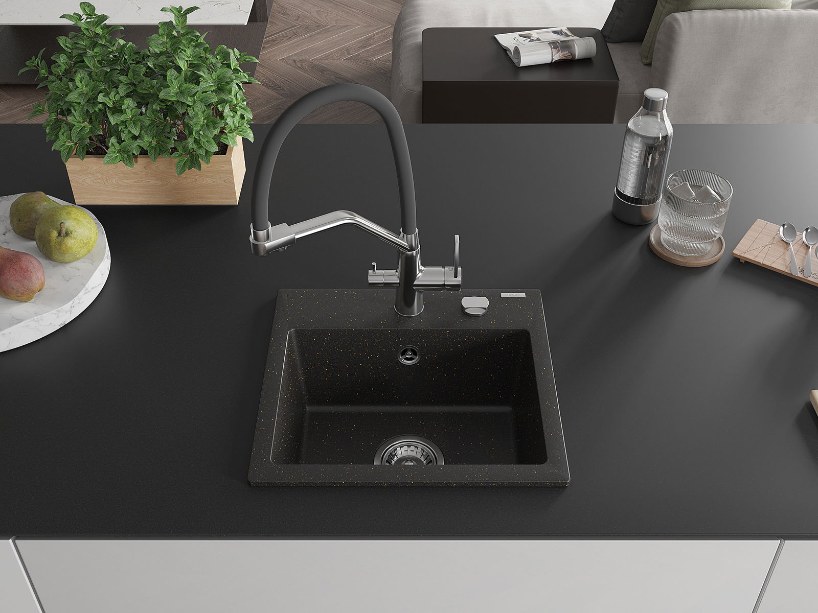 Mexen Milo granitinis vienos angos plautuvė su virtuvės maišytuvu Duo, juoda/auksinė metalika - 6505-75-671701-07