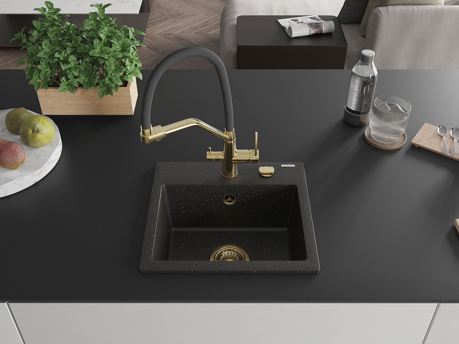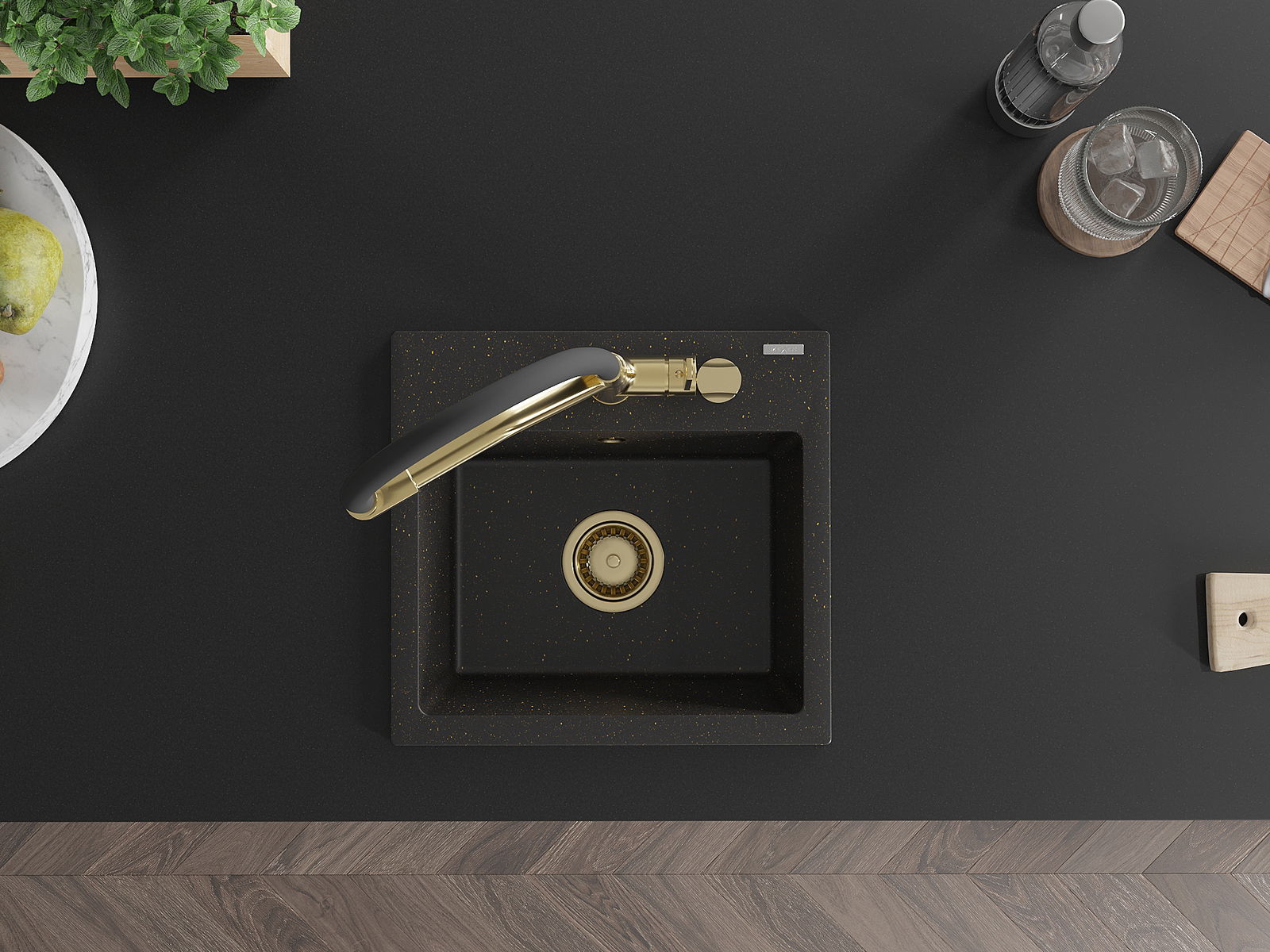 Mexen Milo granito plautuvė su viena dubenimi ir virtuviniu maišytuvu Duo, juoda/auksinė metalika - 6505-75-671701-57-G