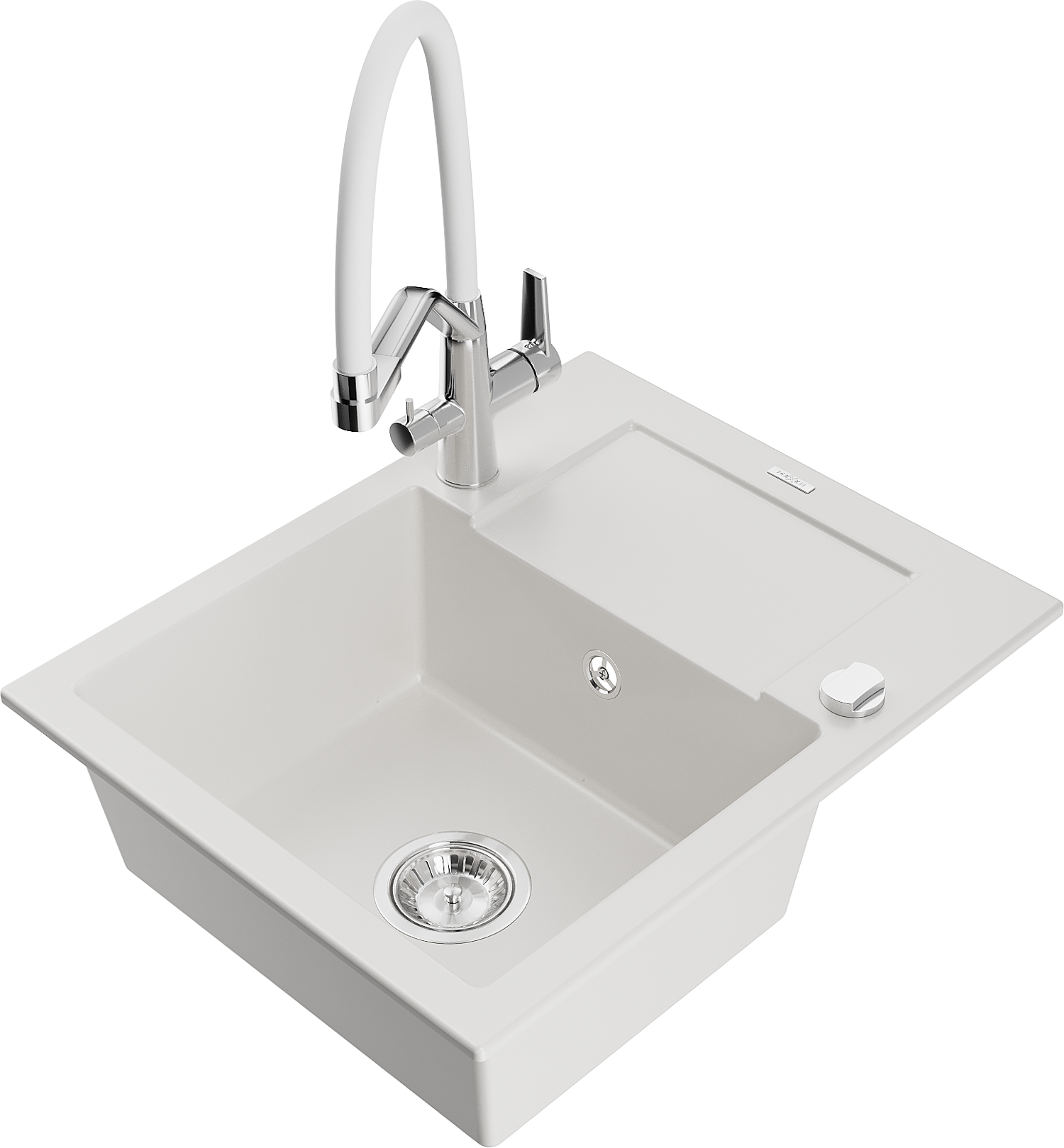 Mexen Enzo virtuvės kriauklė iš granito, 1 skyrelio, su indu ir Duo virtuvės maišytuvu, balta - 6506-20-671701-02