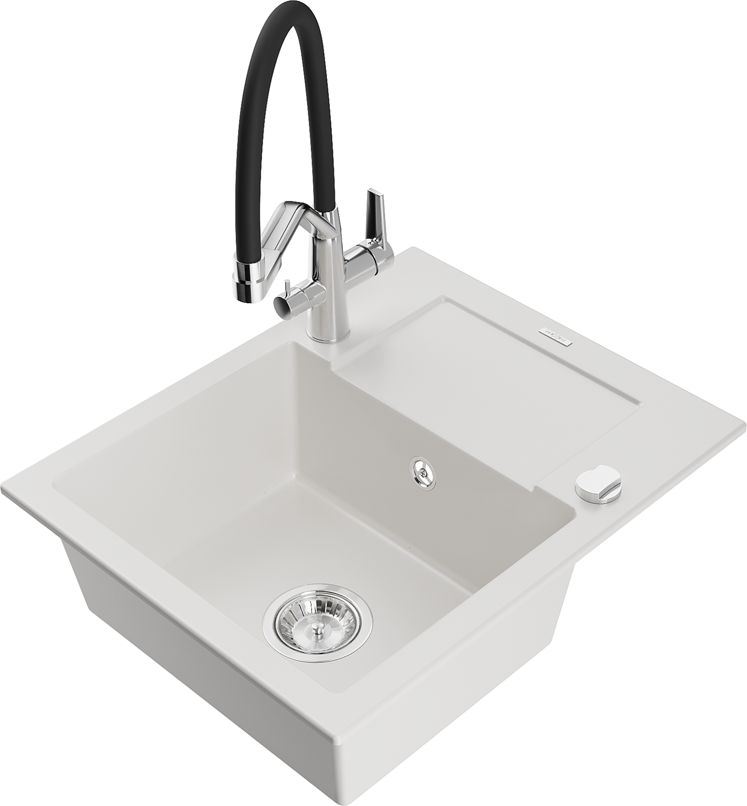 Mexen Enzo granito plautuvė su vienu dubeniu, lašelinė ir virtuvės maišytuvas Duo, balta - 6506-20-671701-07