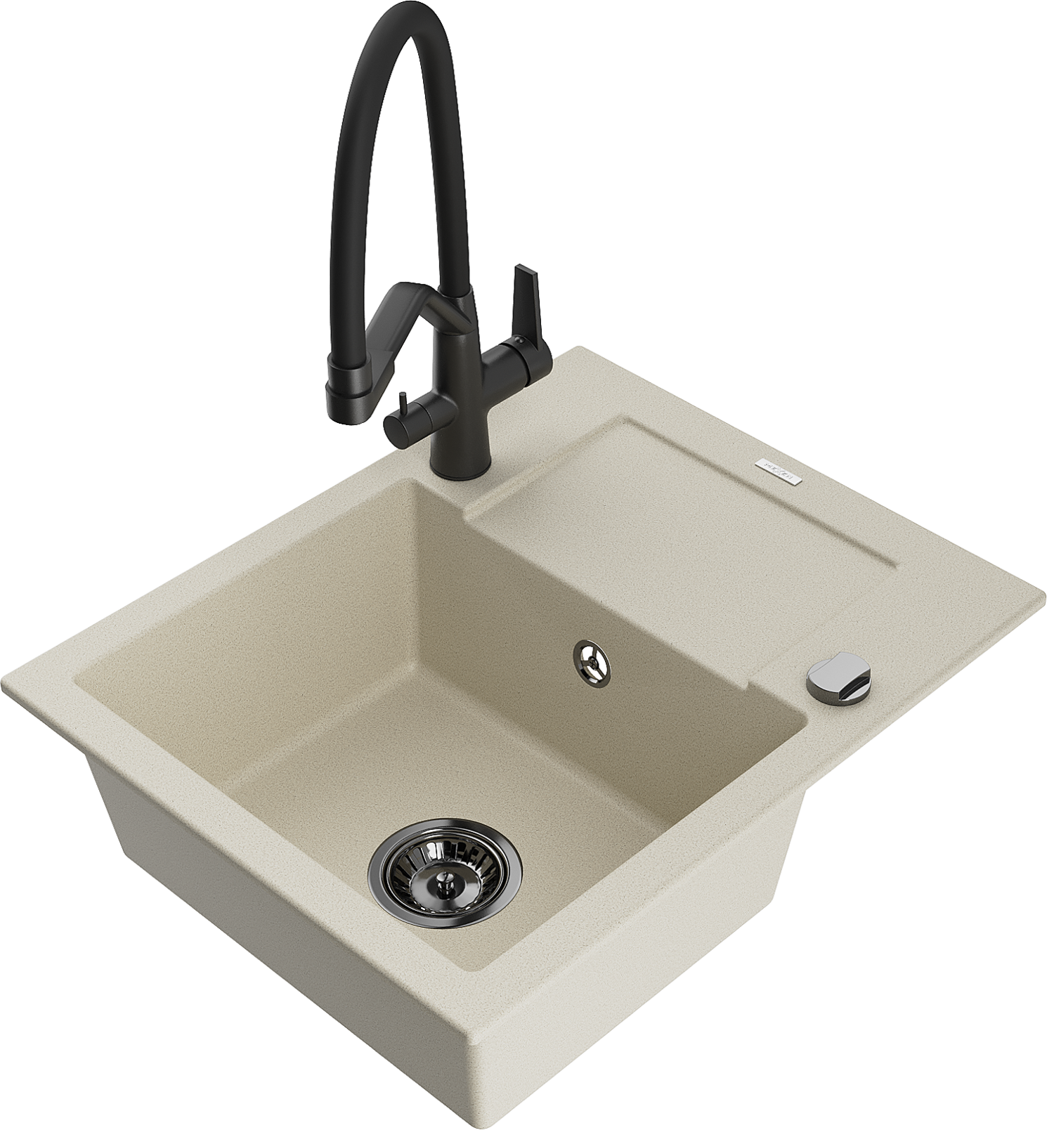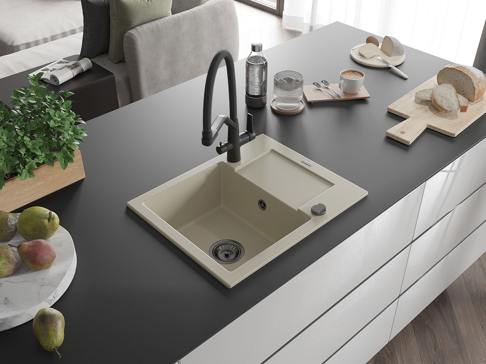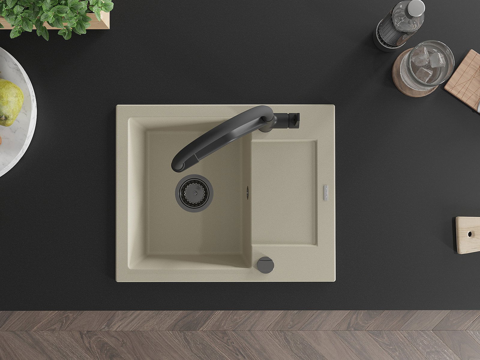 Mexen Enzo Granitinė vienos kameros kriauklė su nutekamuoju paviršiumi ir Duo virtuvės maišytuvu, smėlio spalvos