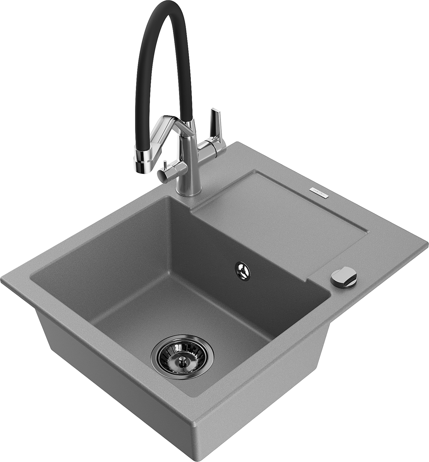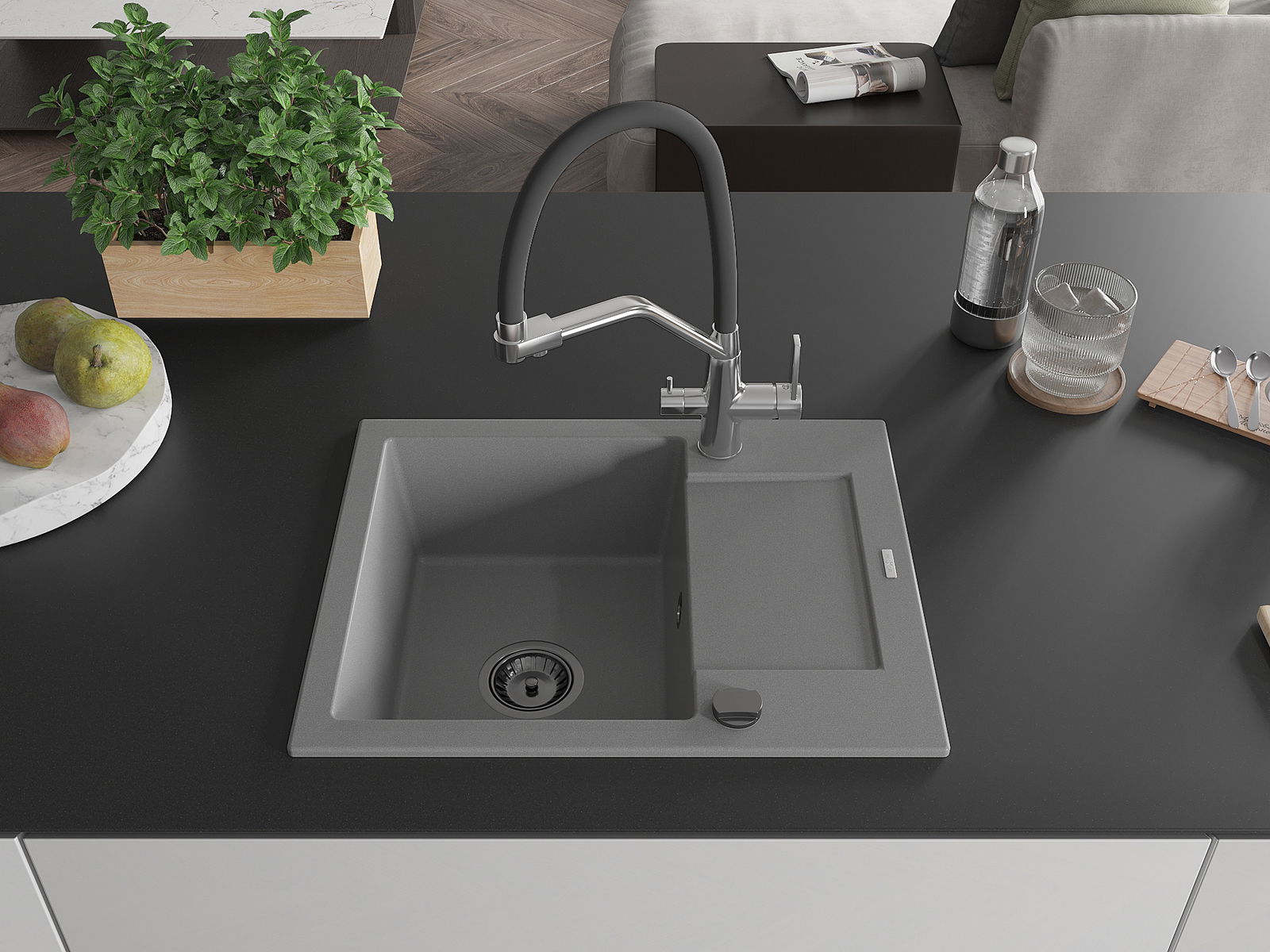 Mexen Enzo granitinis vienos plautuvės kriauklė su nutekamu ir Duo virtuvės maišytuvu, pilkas - 6506-71-671701-07-B