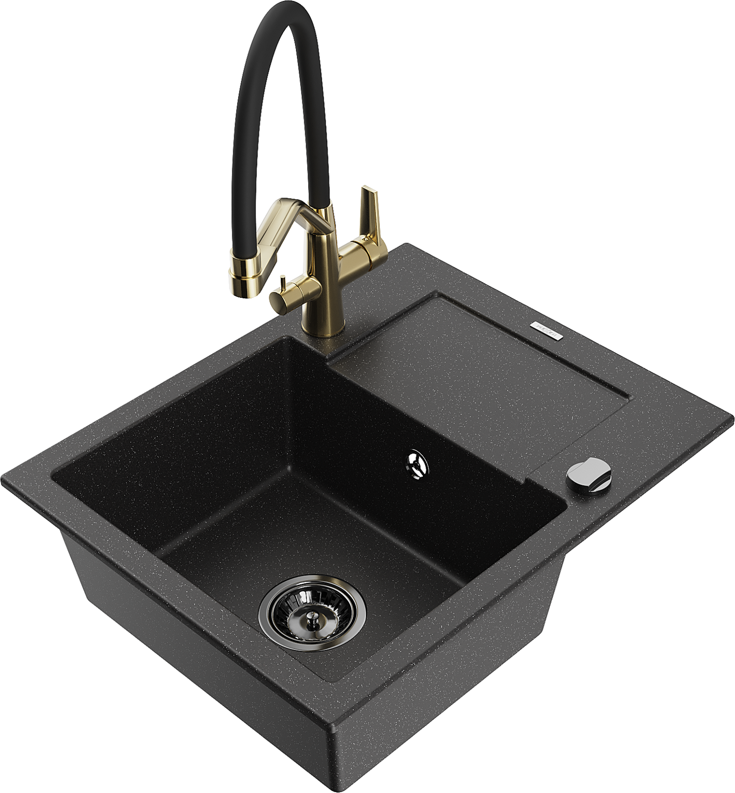 Mexen Enzo vienos plautuvės granitinė virtuvinė kriauklė su nutekamuoju paviršiumi ir maišytuvu Duo, juoda/sidabrinė