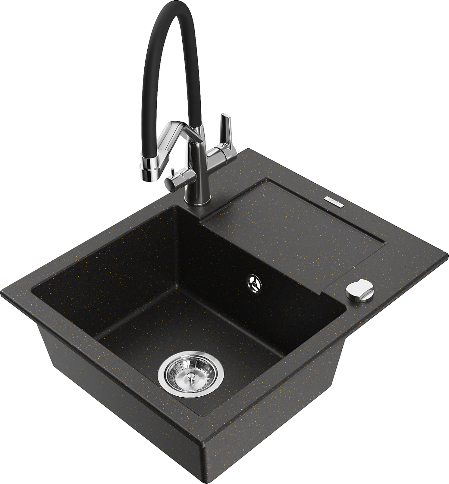 Mexen Enzo 1 dubensio granitinė virtuvės plautuvė su drenažu ir maišytuvu Duo, juodas/auksinis metalikas - 6506-75-671701-07