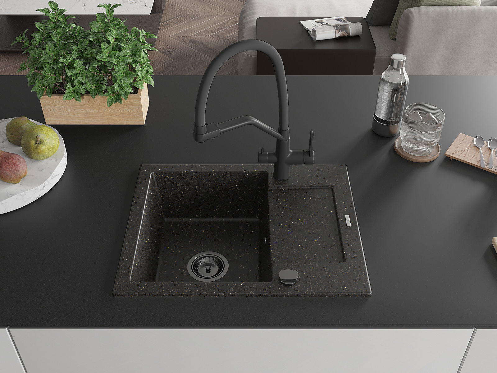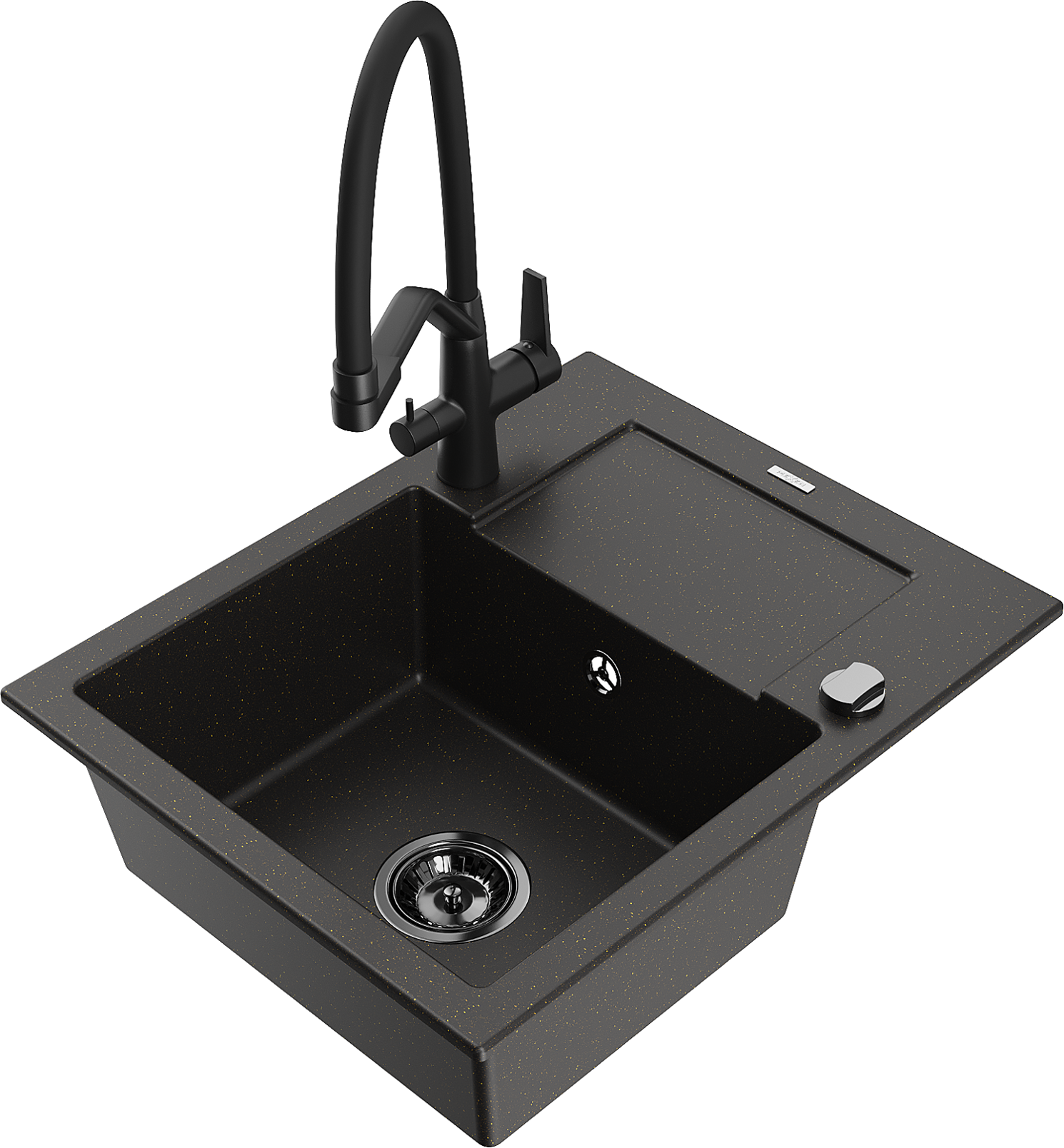Mexen Enzo granitinis vienos kameros virtuvės kriauklė su nutekėjimu ir Duo virtuvės maišytuvu, juodas/auksinis metalikas