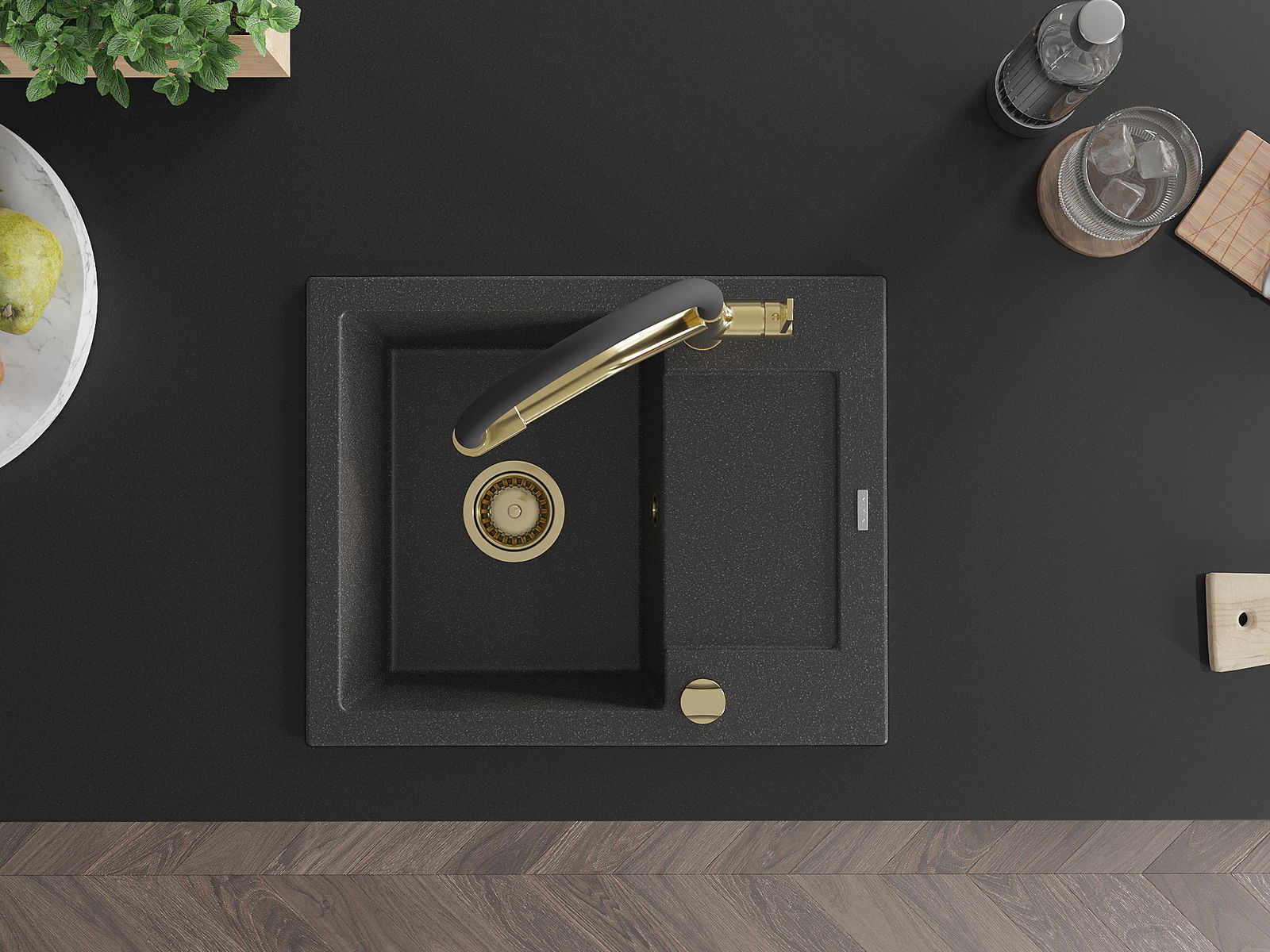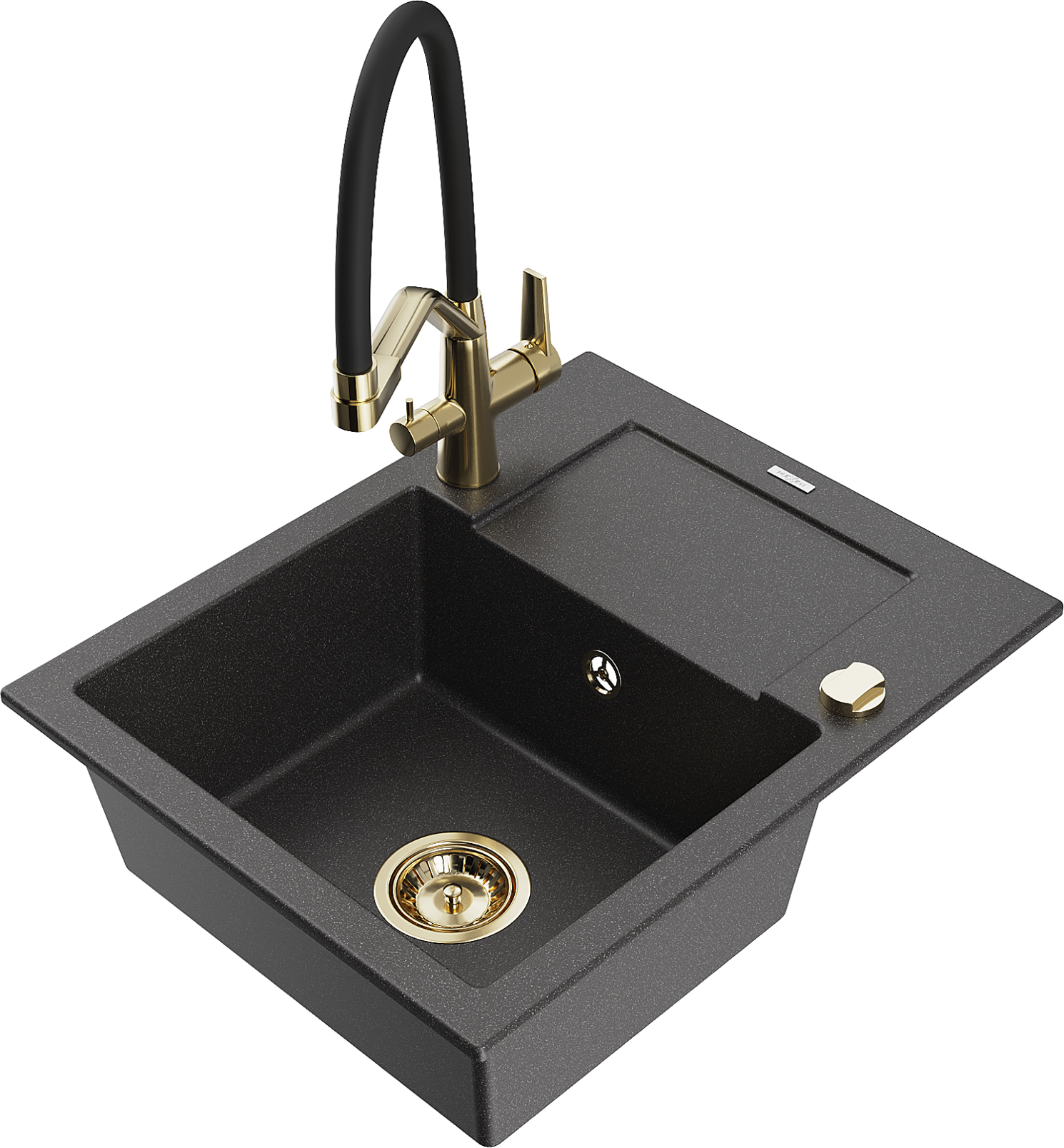 Mexen Enzo granitinė vienos kameros plautuvė su drenažu ir virtuviniu maišytuvu Duo, juoda dėmėta - 6506-76-671701-57-G