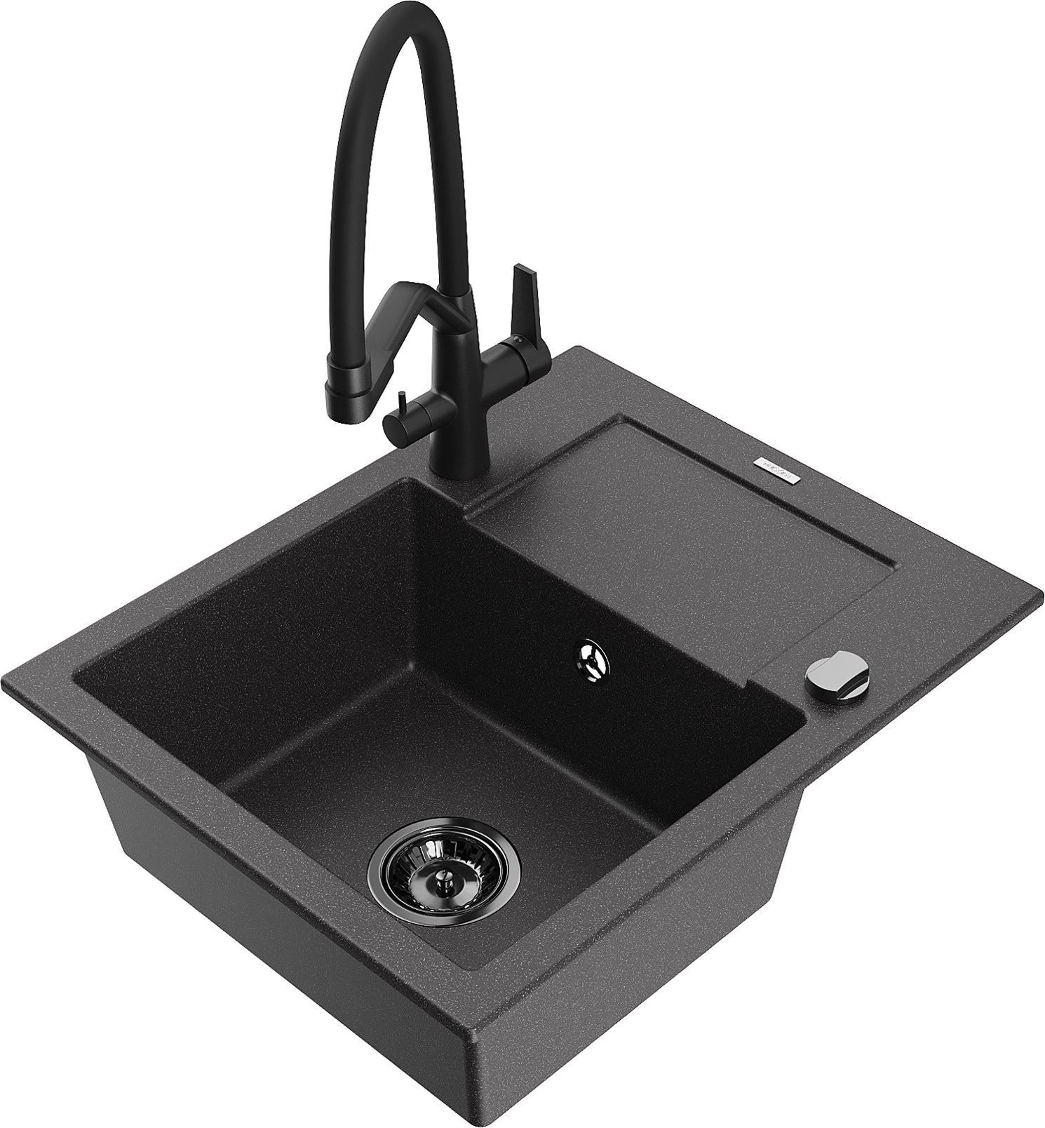 Mexen Enzo granitinė vienos kameros plautuvė su nutekėjimu ir Duo virtuvės maišytuvu, juoda su taškeliais