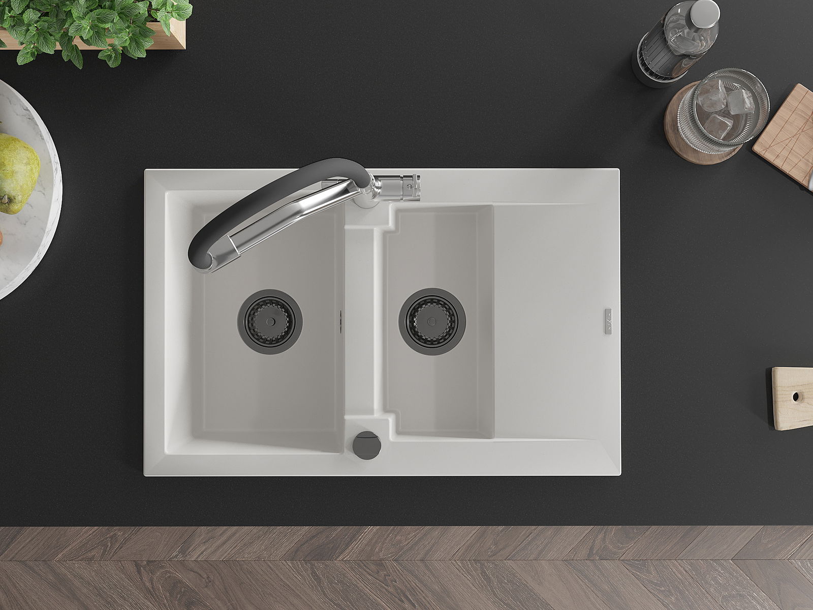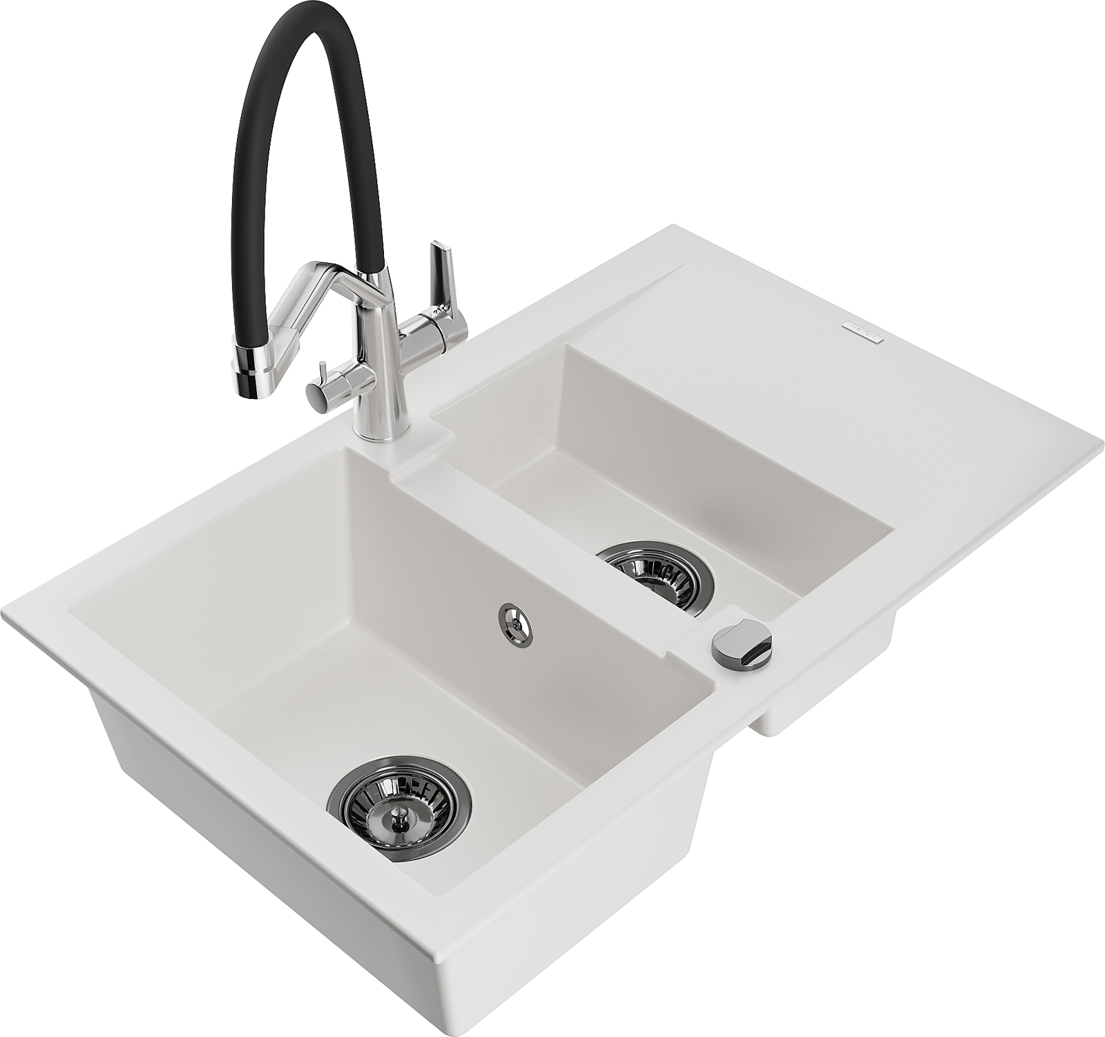 Mexen Gaspar granitinis virtuvės plautuvė 1,5 kamerų su nuvarvėjimu ir virtuvės maišytuvu Duo, balta - 6507-20-671701-07-B