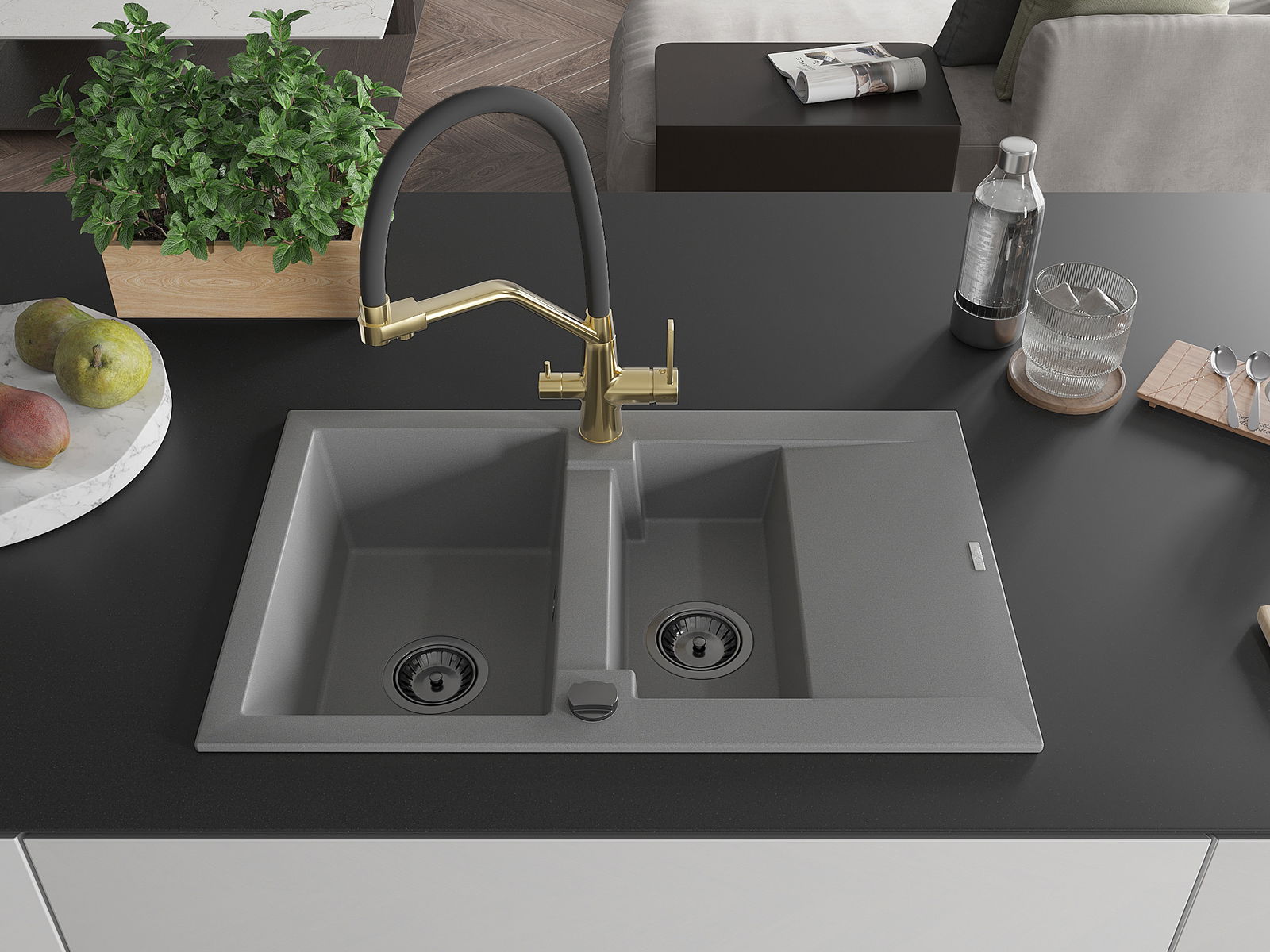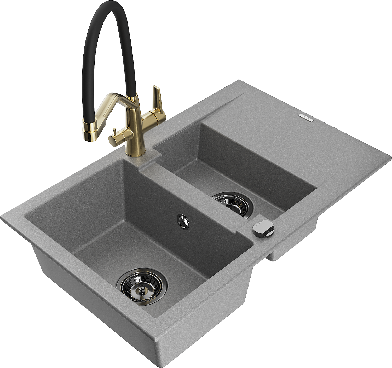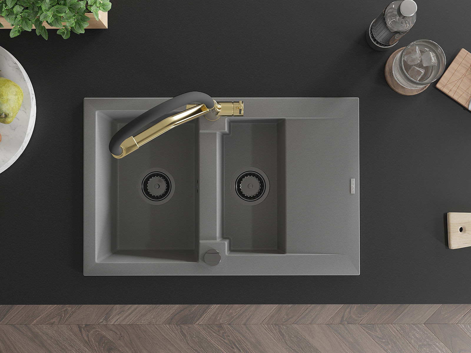 Mexen Gaspar granito plautuvė su 1,5 kameromis, su nutekamuoju padėklu ir maišytuvu Duo, pilka - 6507-71-671701-57-B