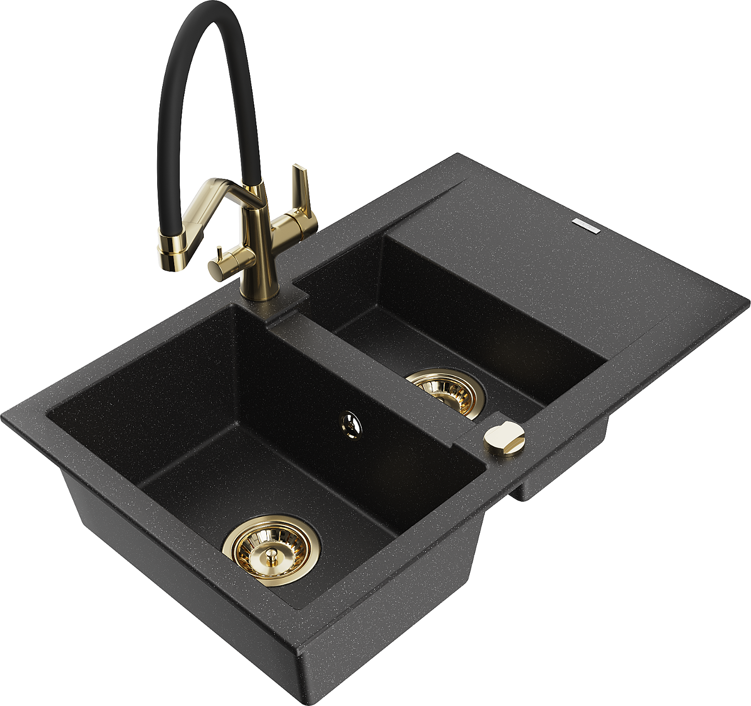 Mexen Gaspar granitinė 1,5 skylių plautuvė su nuvarvėjimo lentynėle ir virtuviniu maišytuvu Duo, juoda/sidabrinė