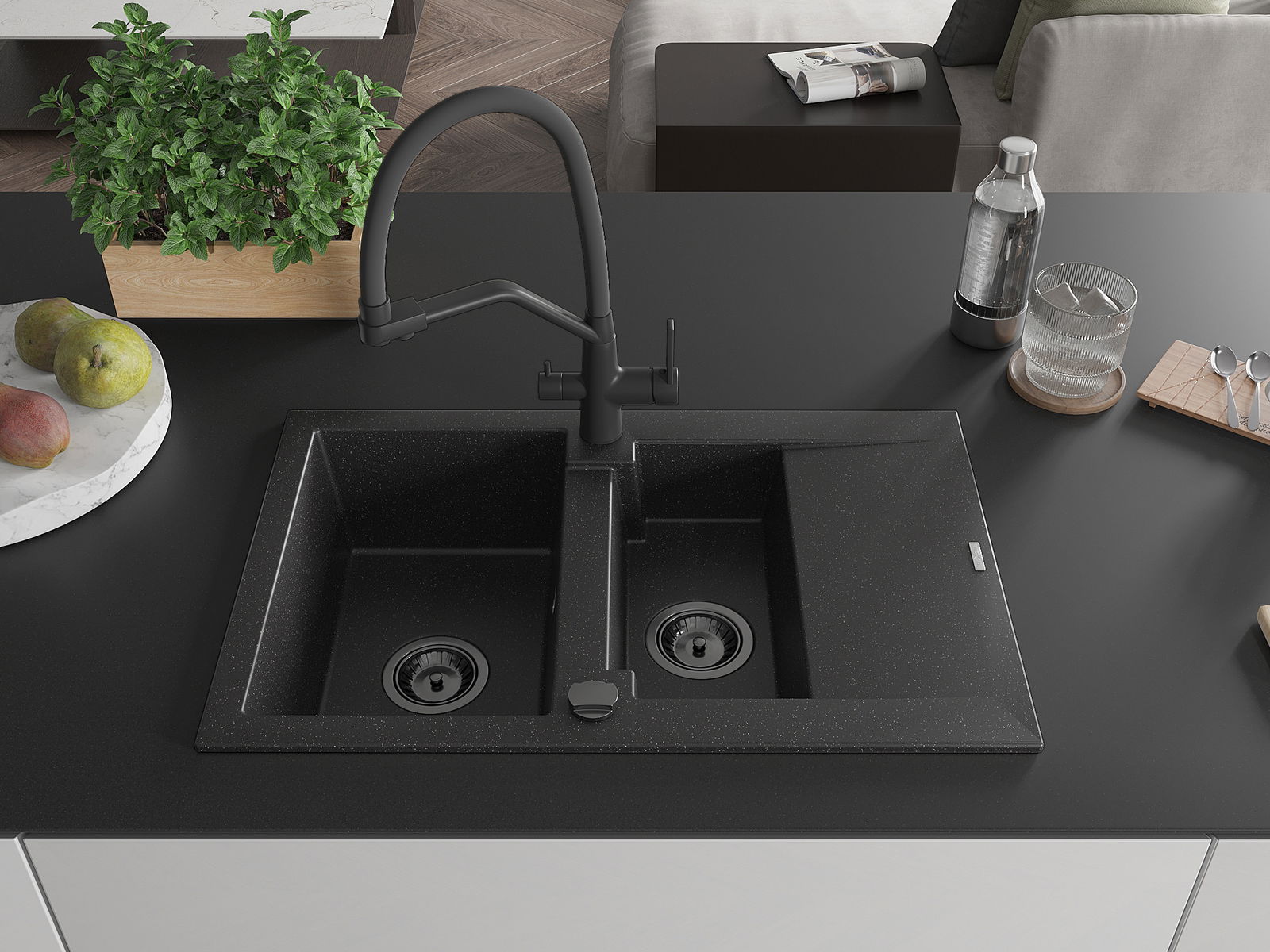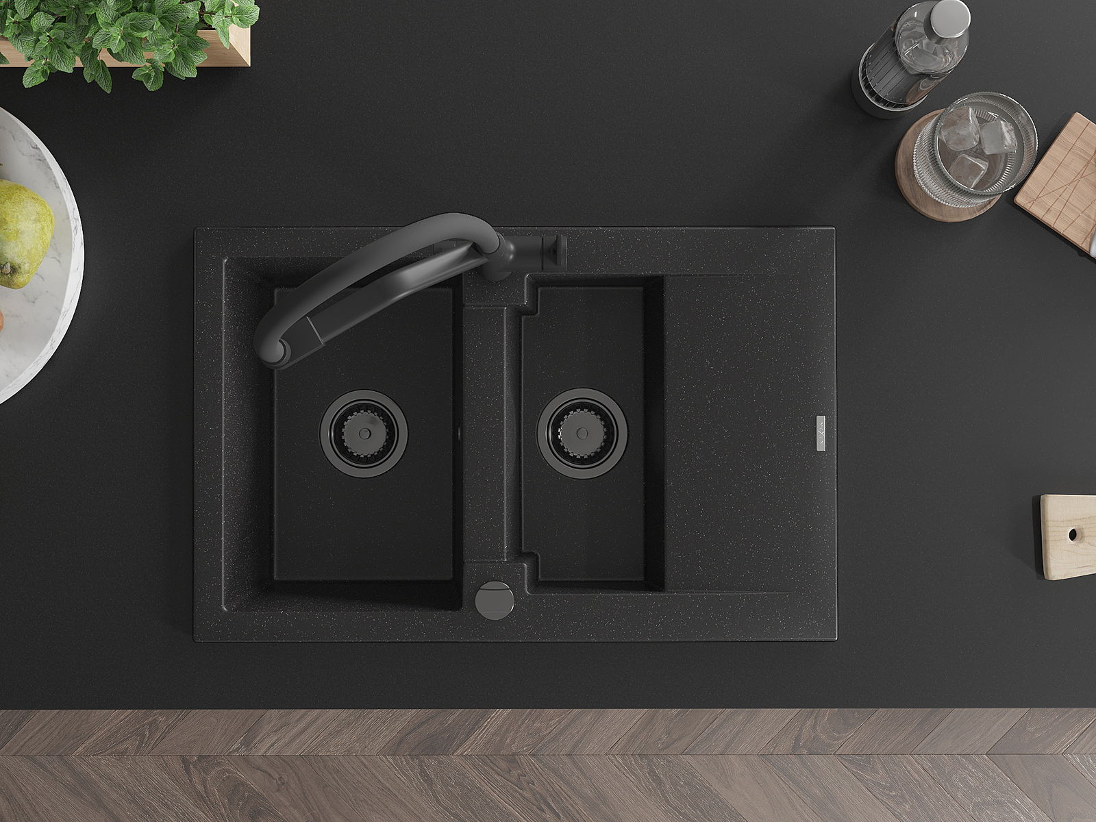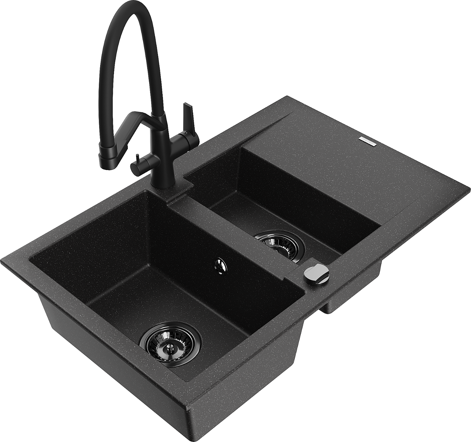 Mexen Gaspar granitinis virtuvės kriauklė 1,5-komorų su nusausintuvu ir Duo maišytuvu, juodas/sidabrinis - 6507-73-671701-70-B