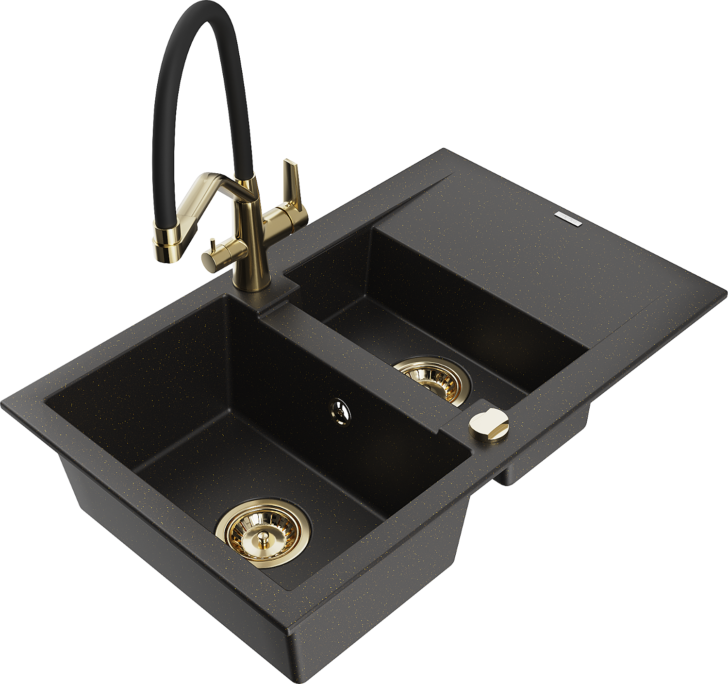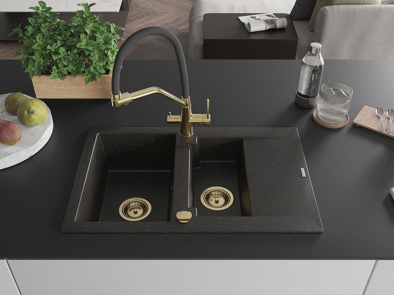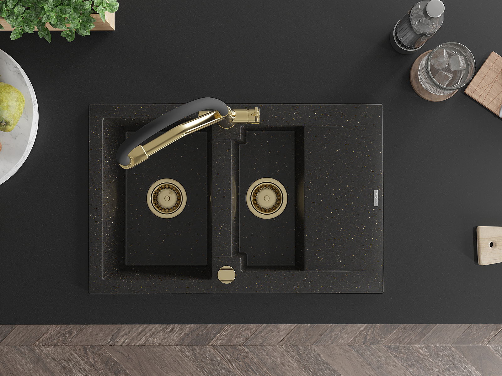 Mexen Gaspar granitinė 1,5 skyrių kriauklė su nusausintuvu ir Duo virtuviniu maišytuvu, juoda/auksinis metalikas