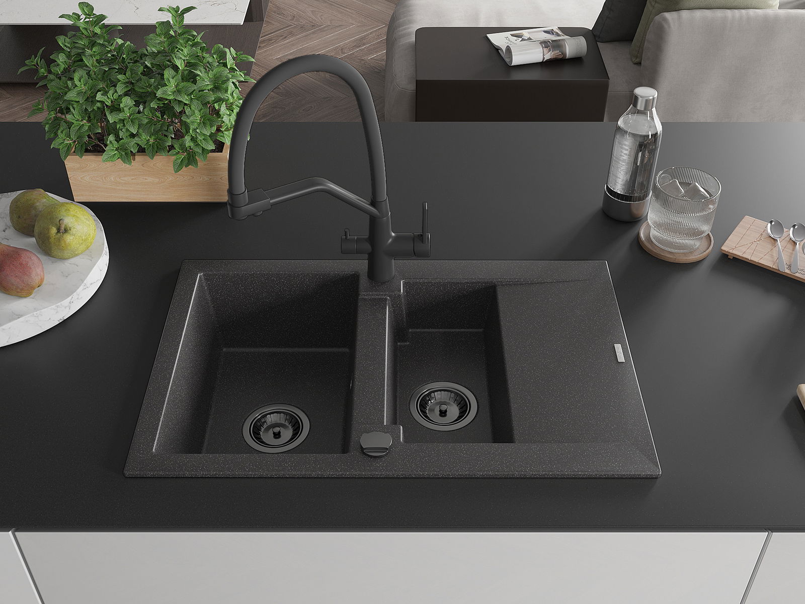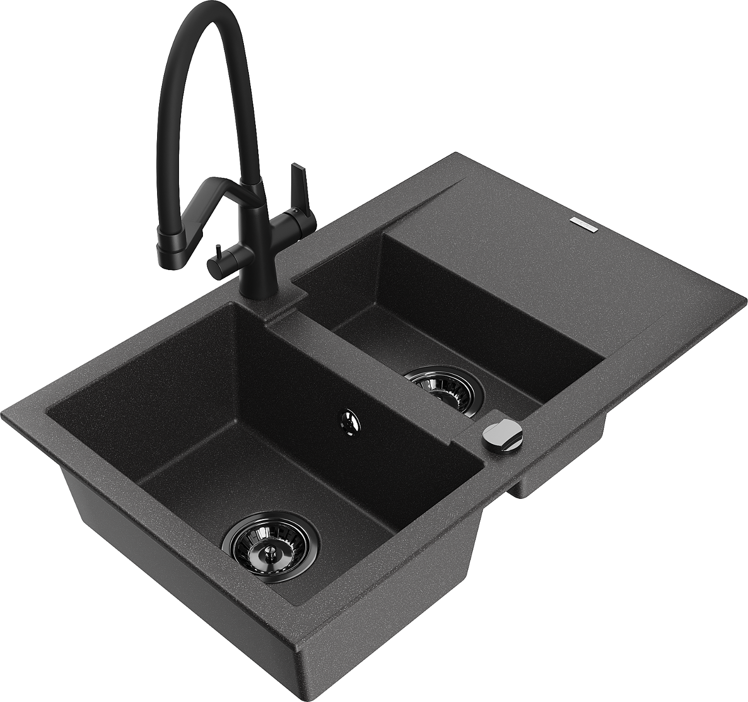 Mexen Gaspar granitinė plautuvė 1,5 skylių su lašintuvu ir virtuviniu maišytuvu Duo, juoda tašyta - 6507-76-671701-70-B