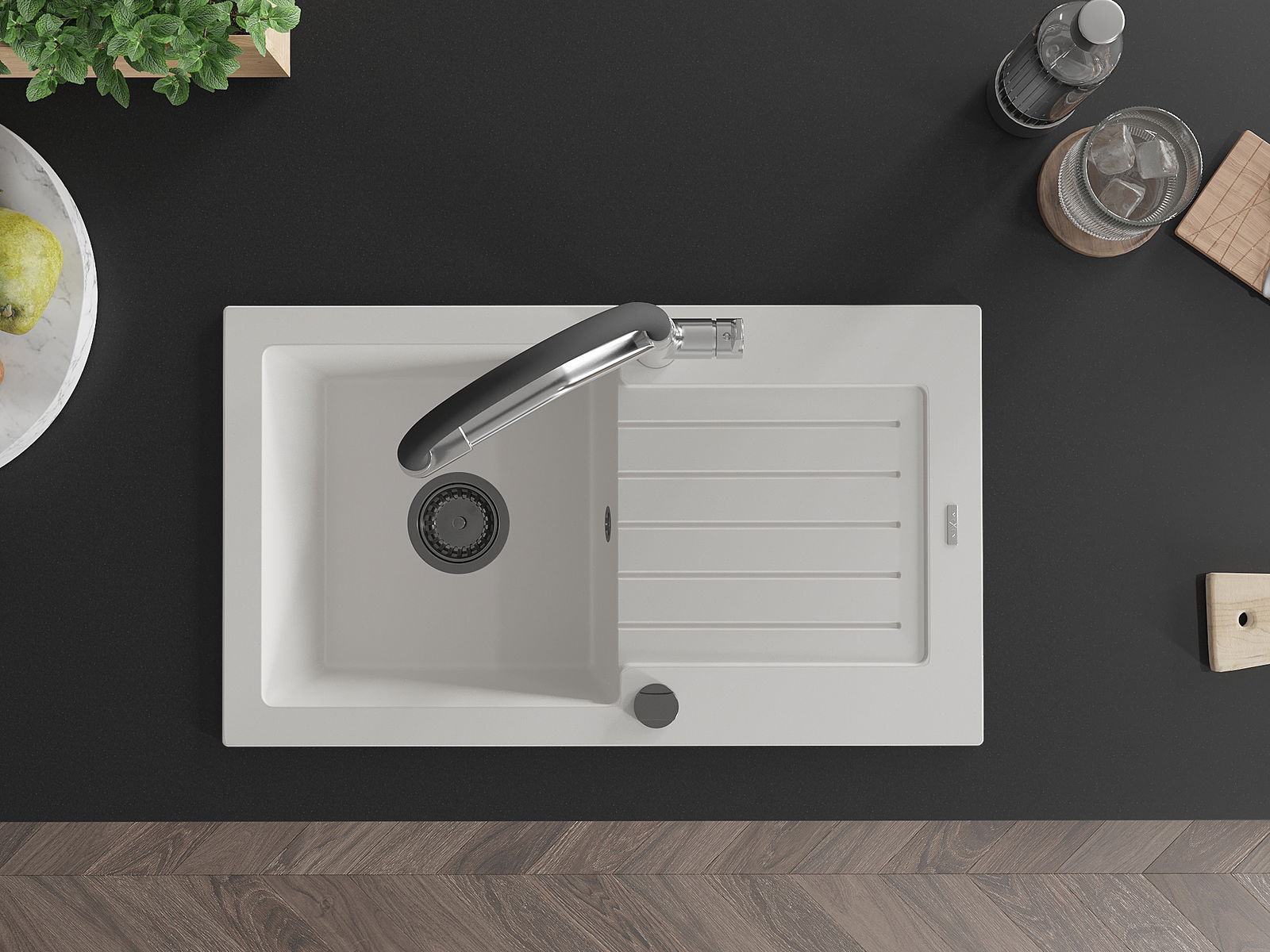 Mexen Pablo granitinė vienos dubens plautuvė su nusausinimo ir virtuvės maišytuvu Duo, balta - 6510-20-671701-07-B