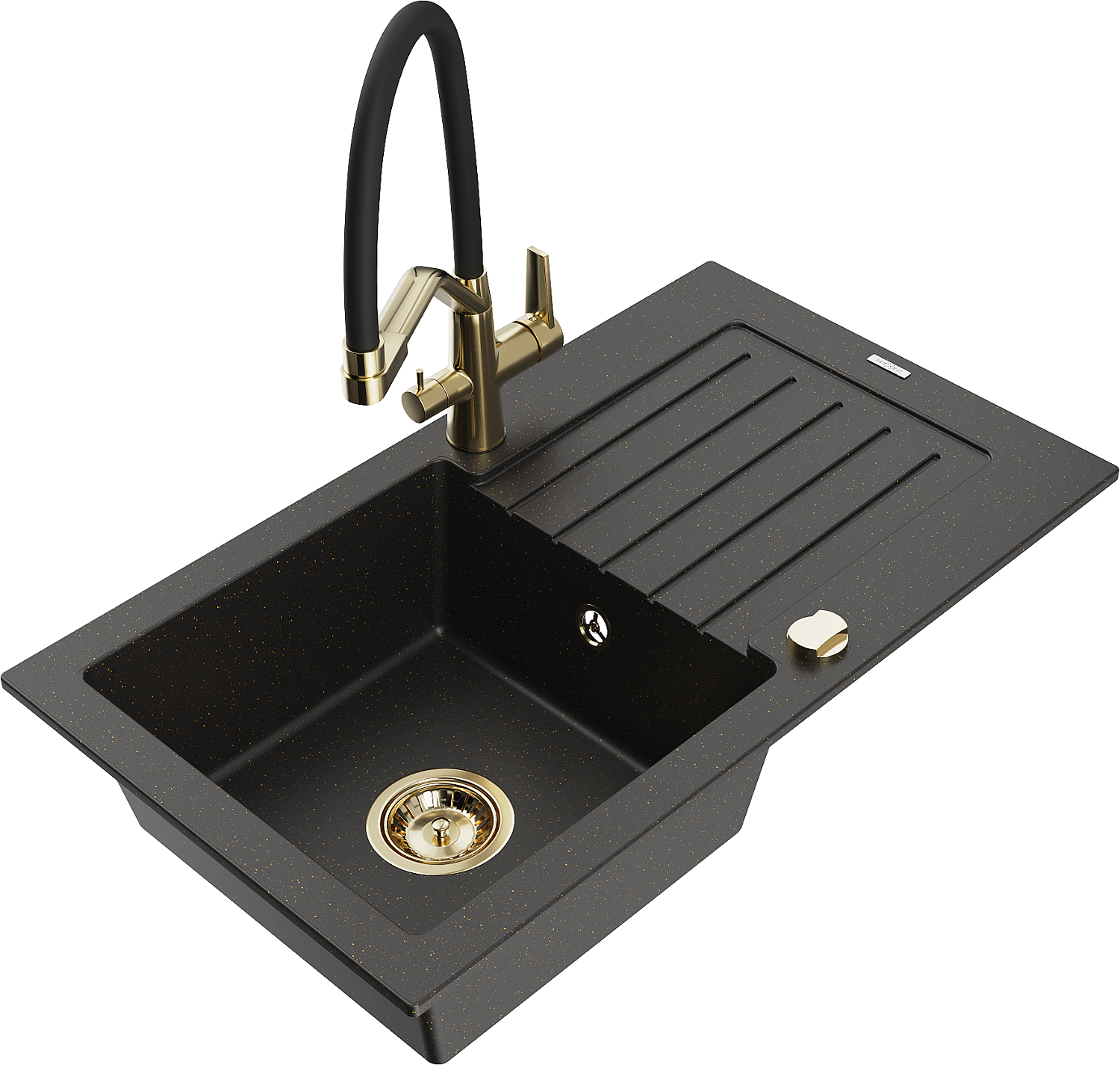 Mexen Pablo granitinė vienos kameros plautuvė su nusausinimo skyriumi ir virtuvės maišytuvu Duo, juoda/auksinė metalo