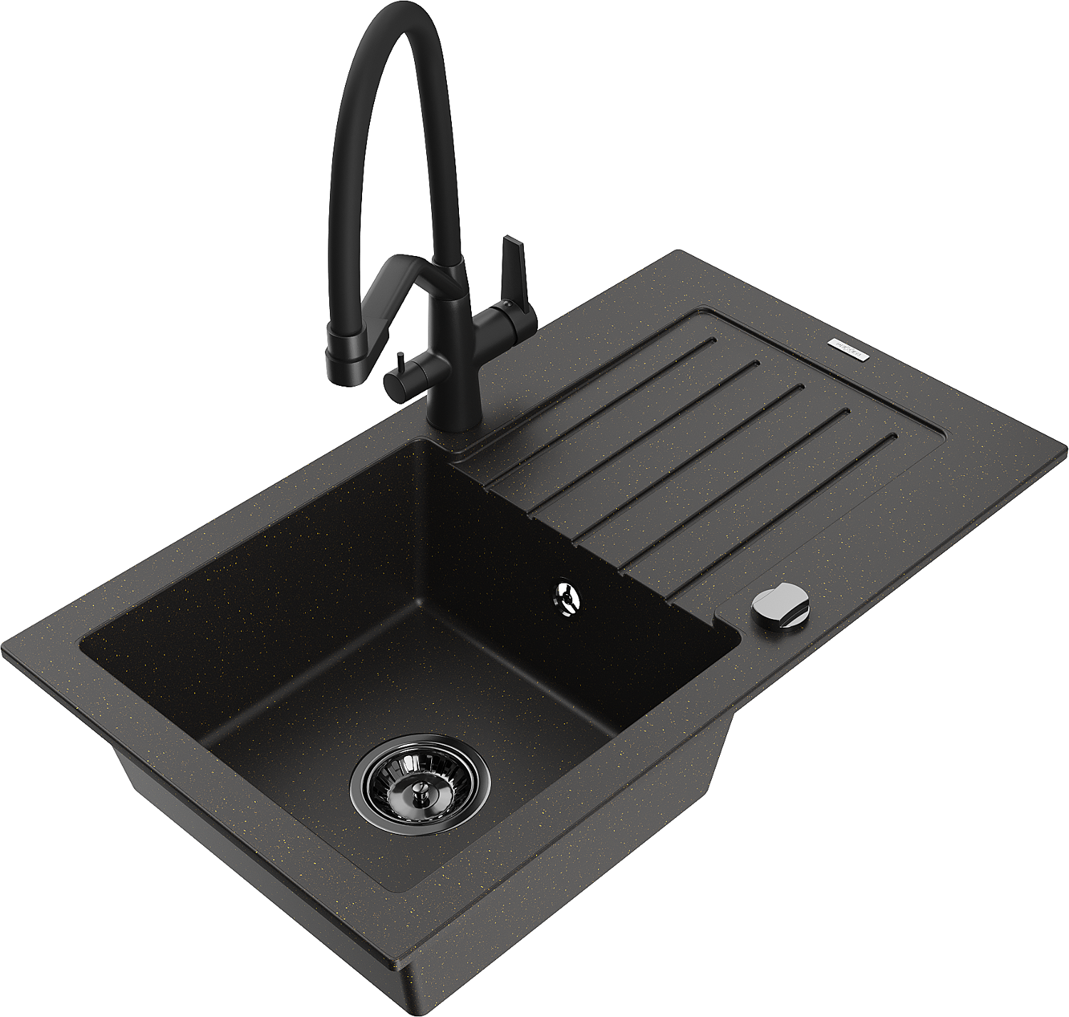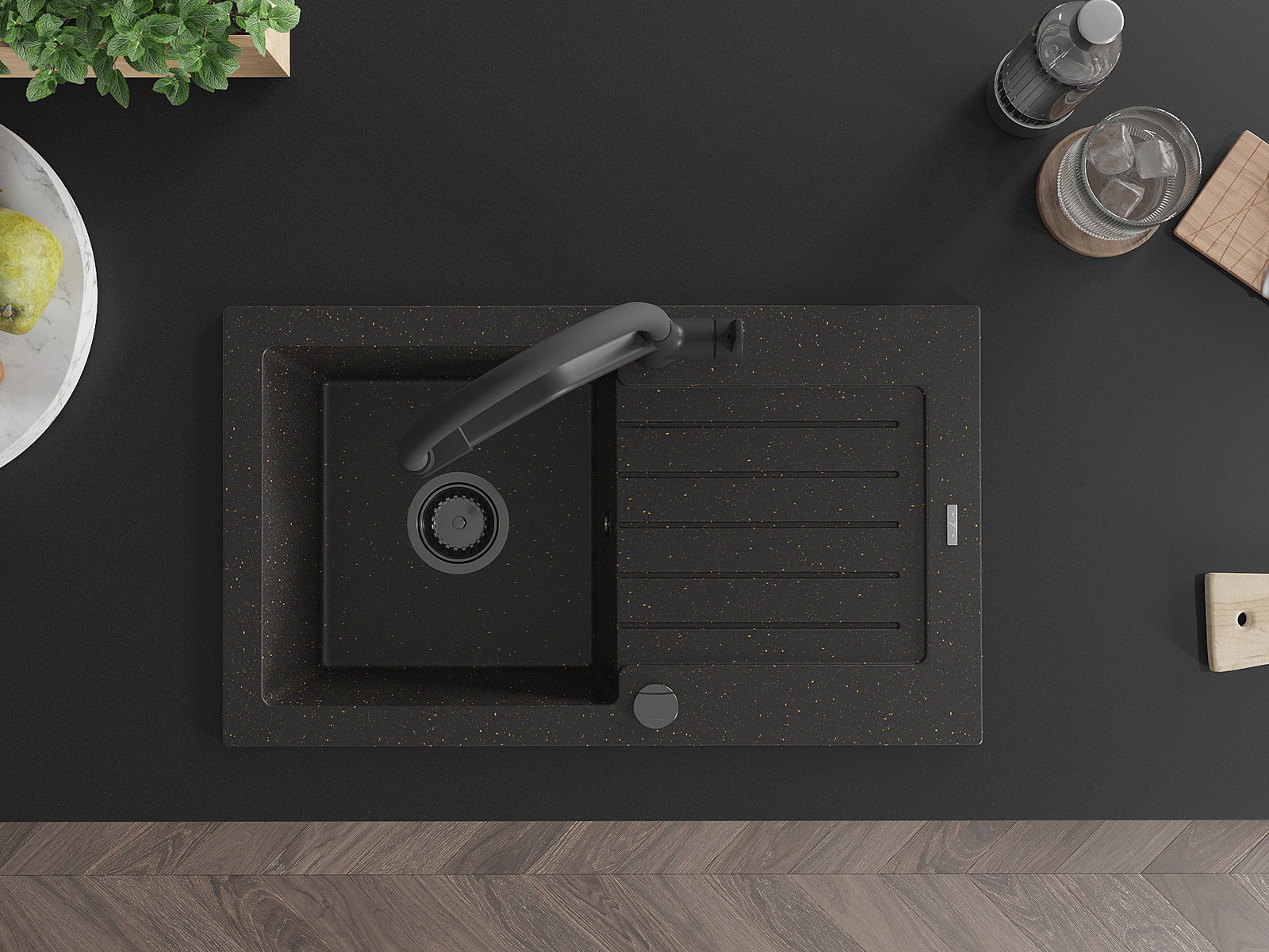 Mexen Pablo granitinė vienos plautuvės kriauklė su nutekėjimu ir virtuviniu maišytuvu Duo, juodas/auksinis metalikas