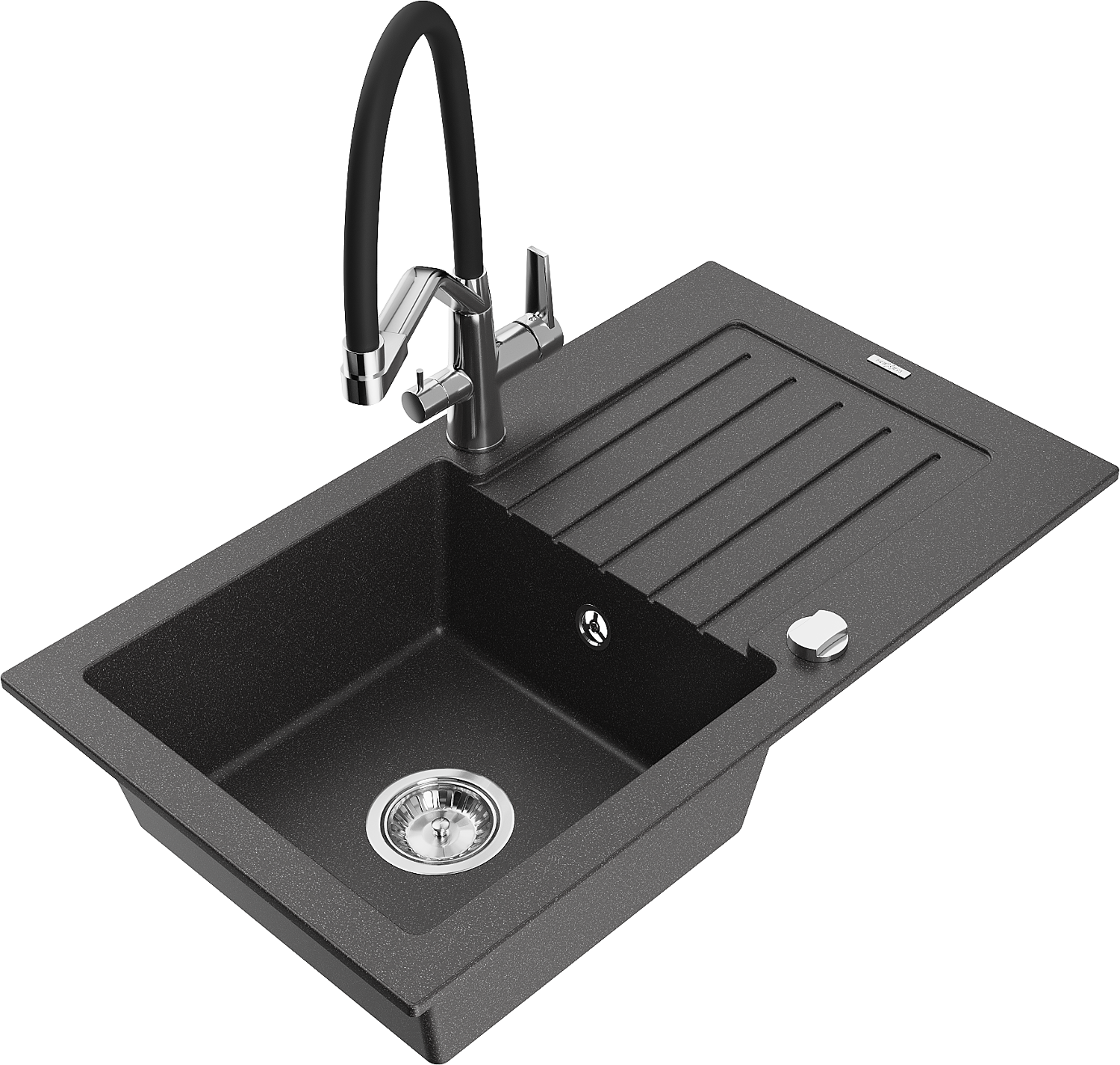 Mexen Pablo granitinė vienos dalies kriauklė su nusausintuvu ir virtuvės baterija Duo, juoda su dėmelėmis