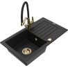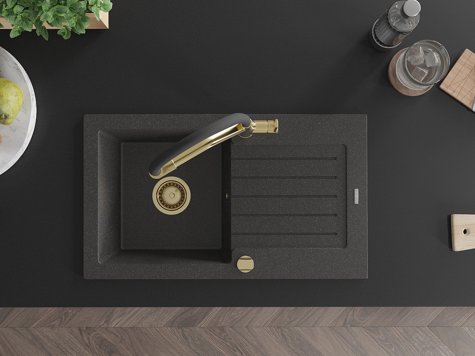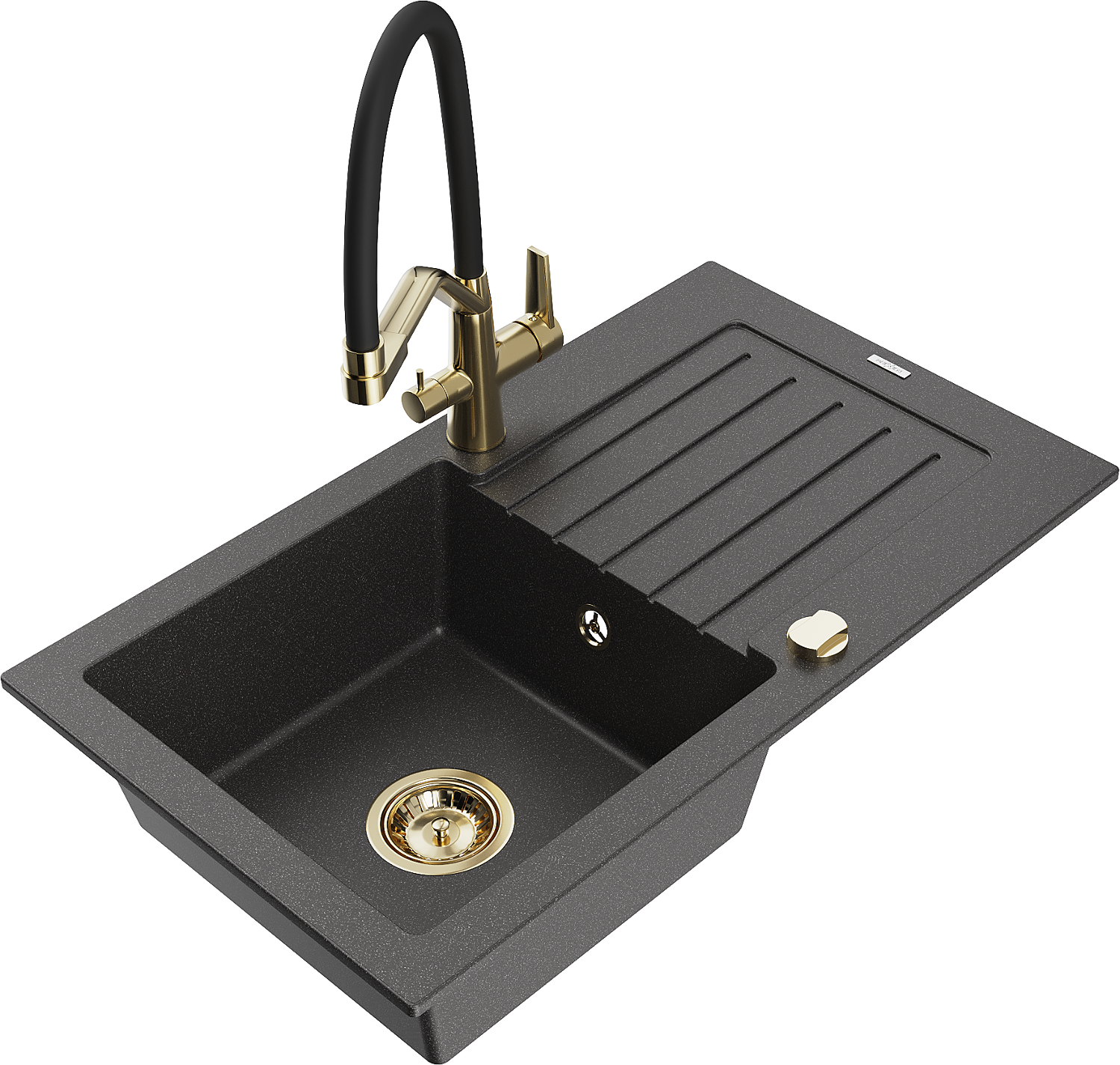 Mexen Pablo granitinis vienos kameros plautuvas su nutekamu ir virtuviniu maišytuvu Duo, juodas taškuotas - 6510-76-671701-57-G