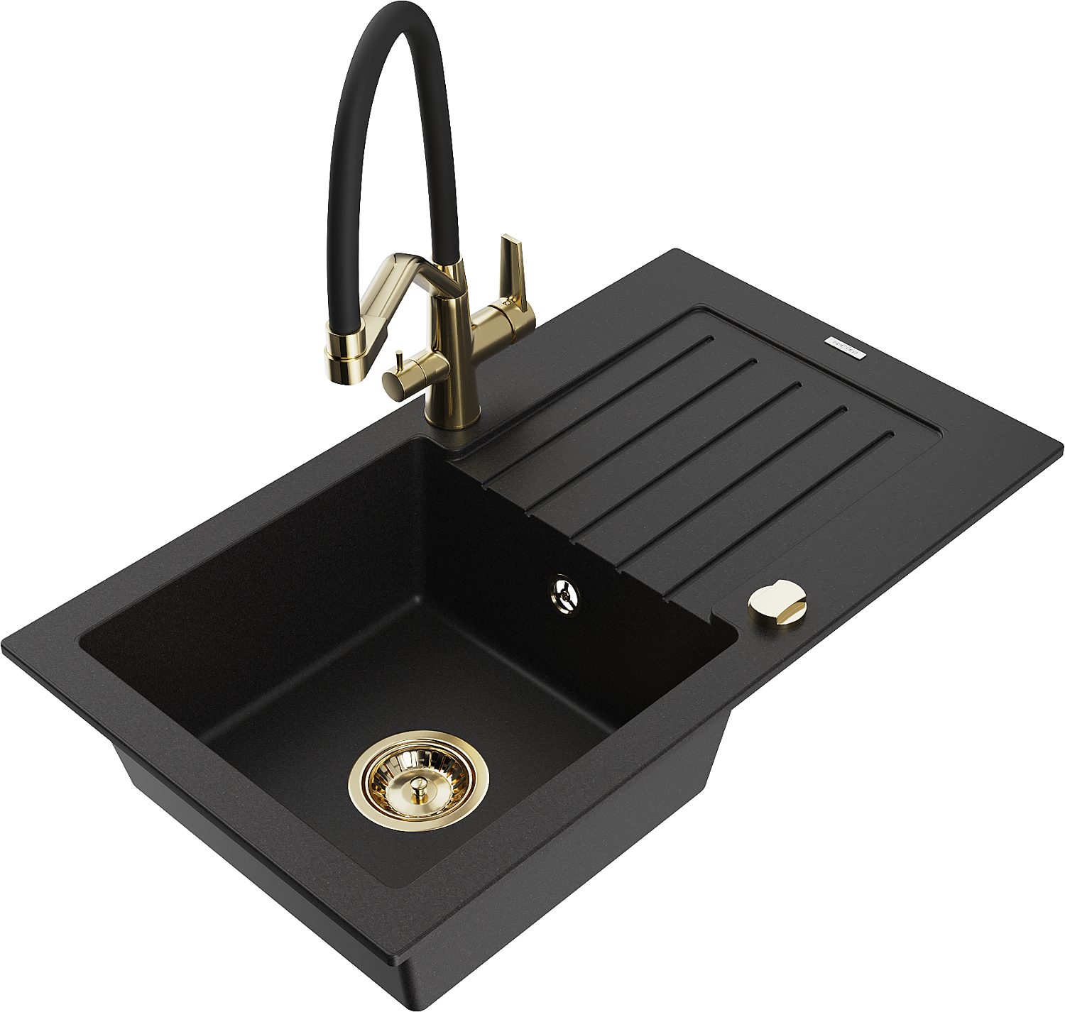 Mexen Pablo granitinė vienos kameros kriauklė su nusausintoju ir Duo virtuviniu maišytuvu, juoda - 6510-77-671701-57-G