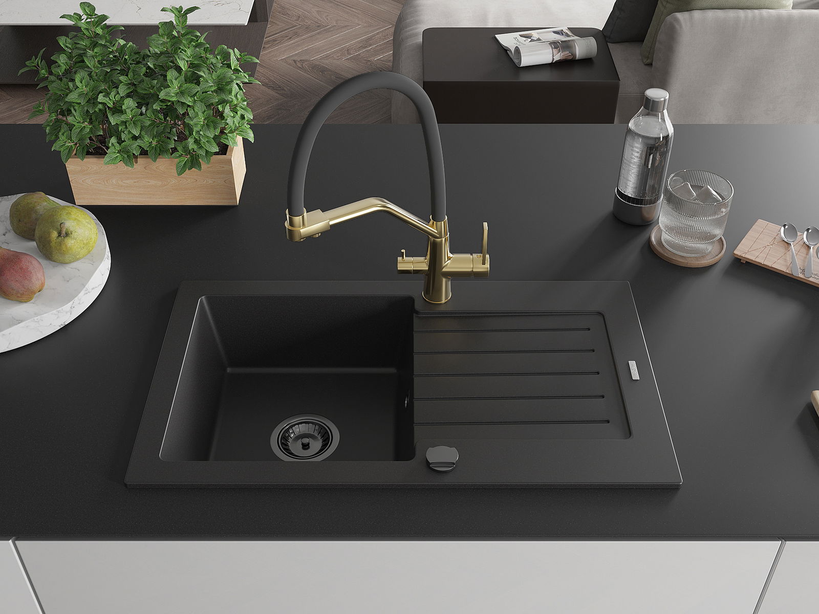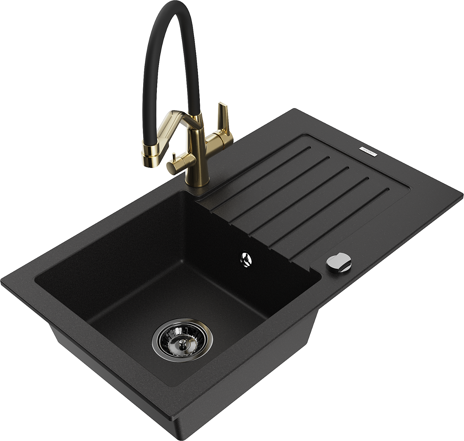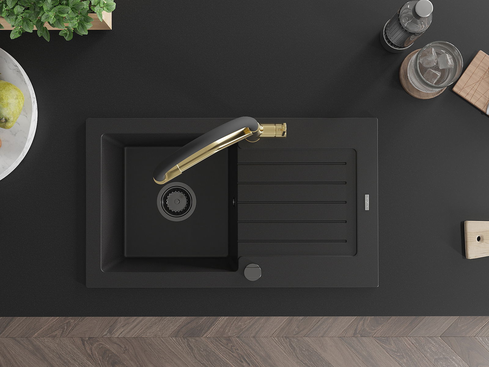 Mexen Pablo granitinis vienos plautuvės kriauklė su nusausintuvu ir virtuviniu maišytuvu Duo, juodas - 6510-77-671701-57-B