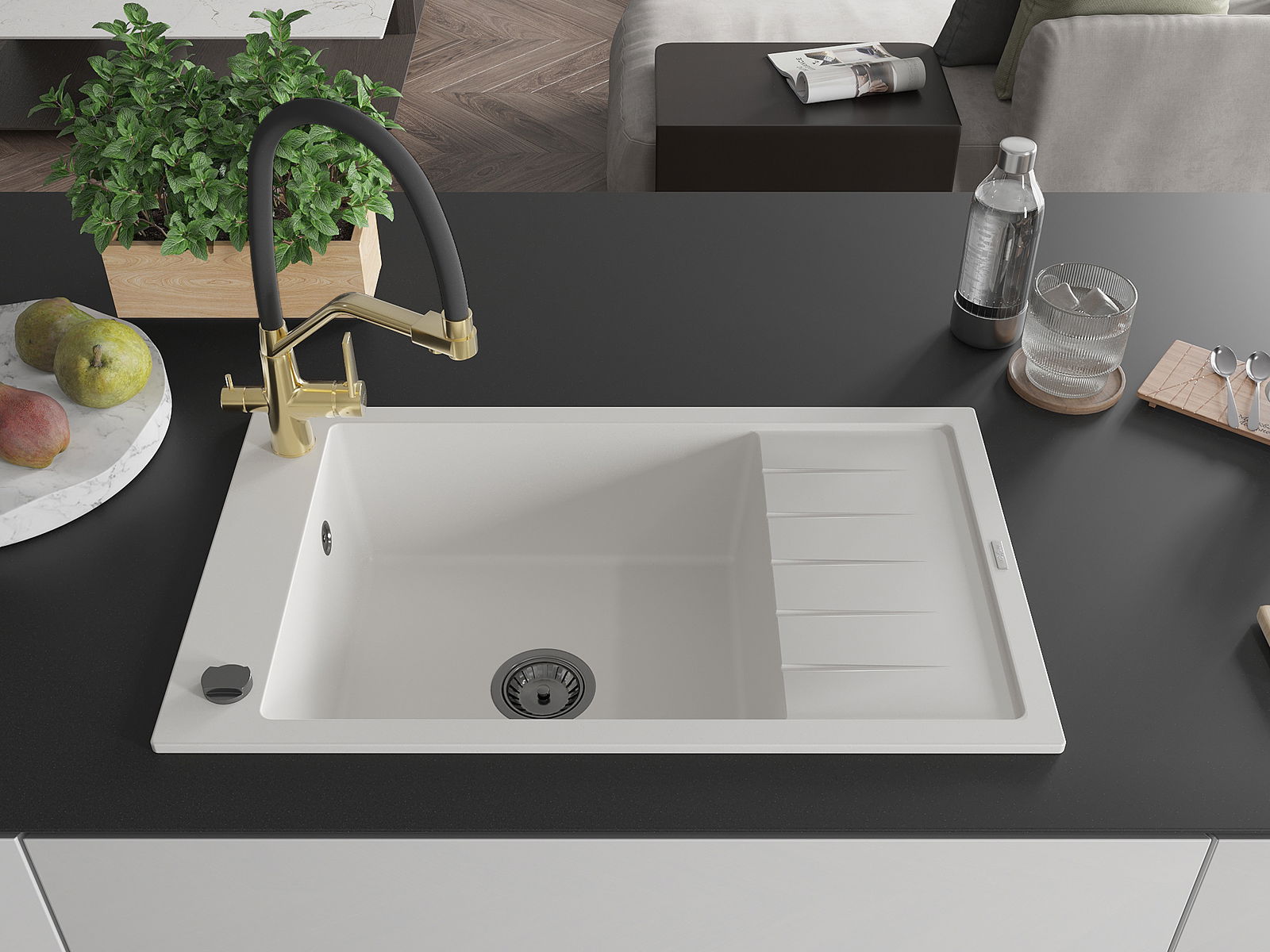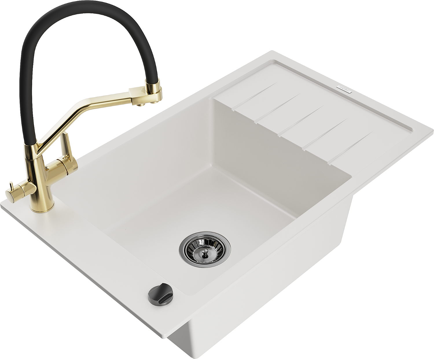 Mexen Elias vienos plautuvės granito kriauklė su nubėgimo vieta ir Duo virtuviniu maišytuvu, balta - 6511-20-671701-57-B