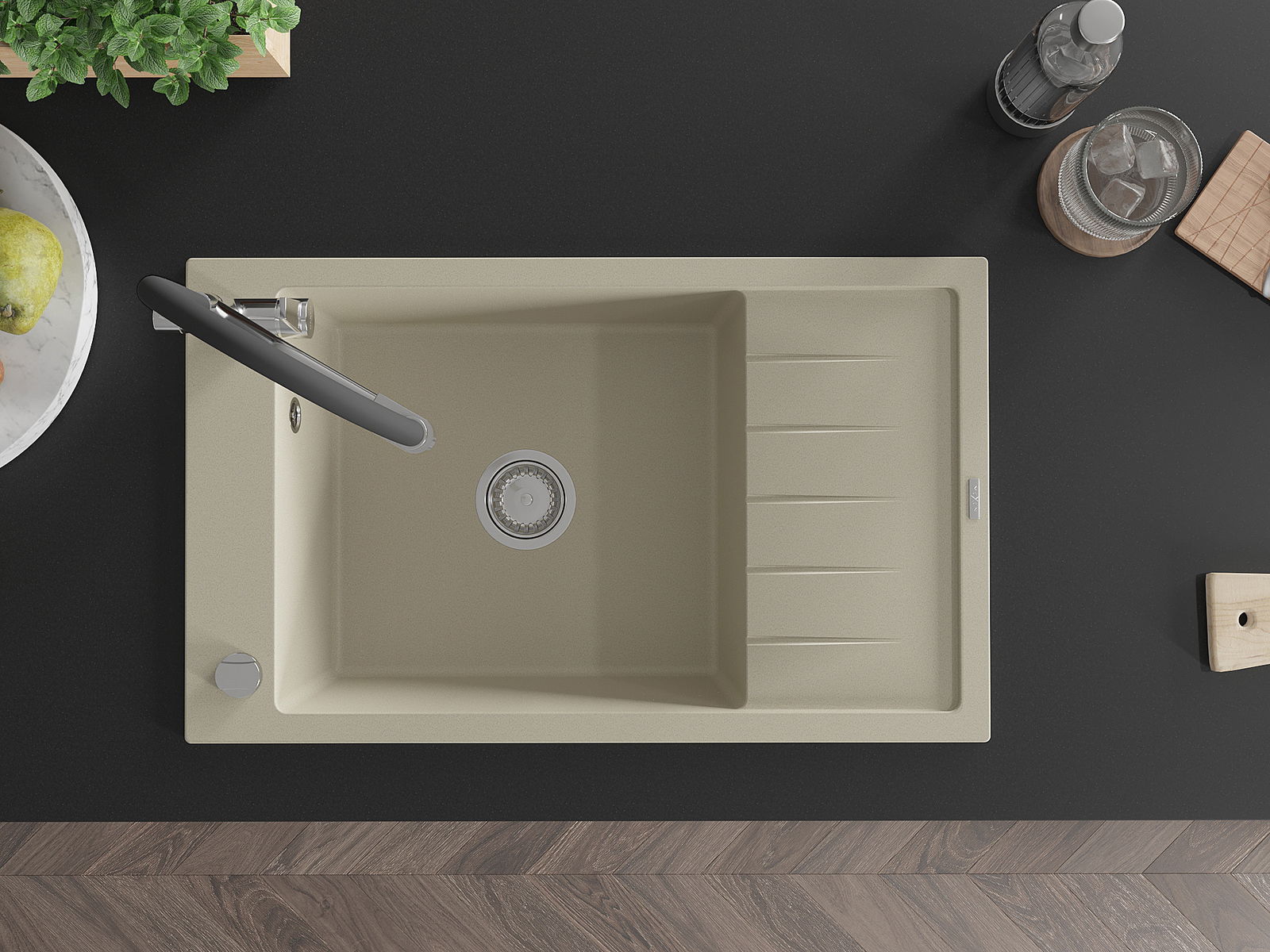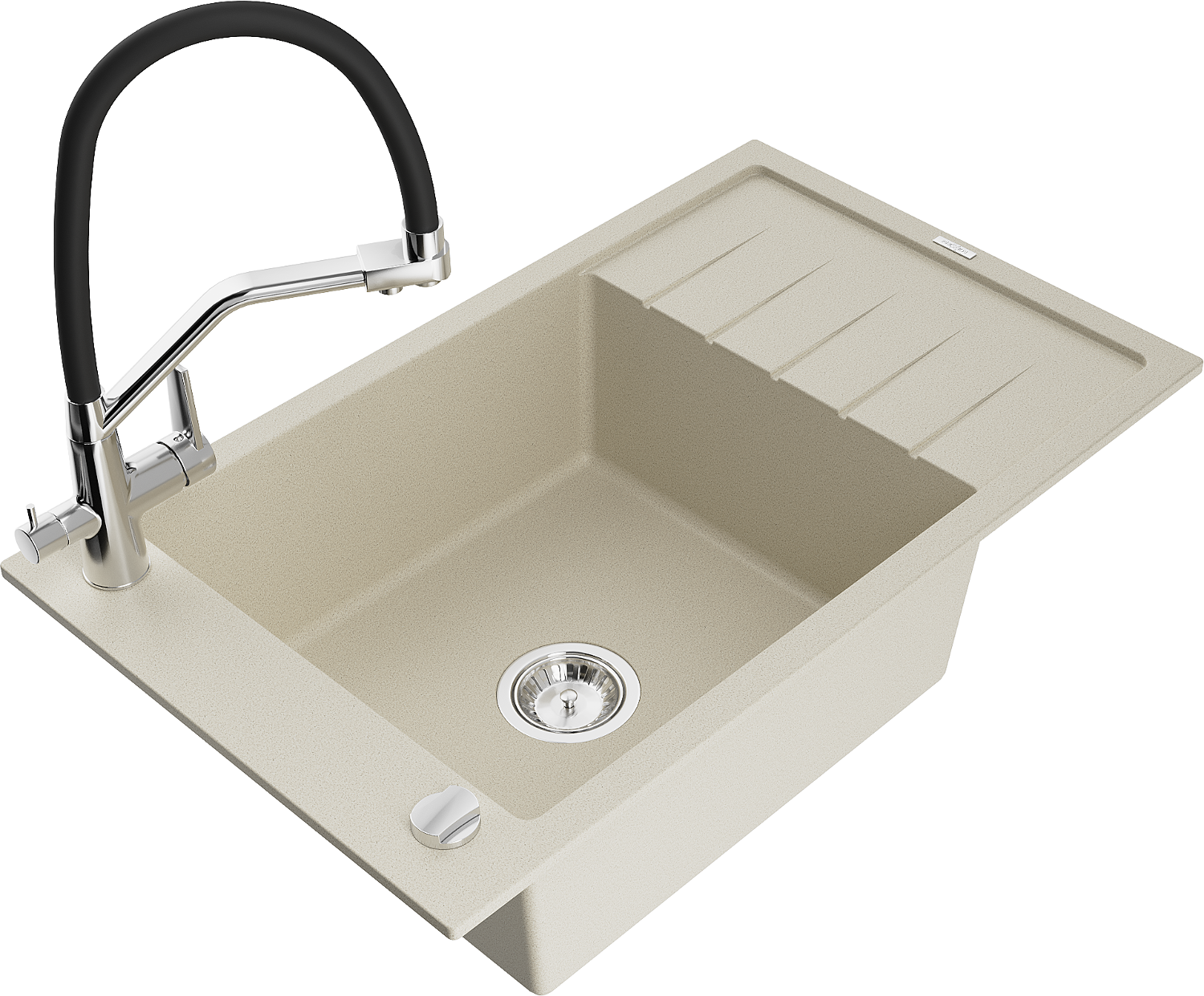 Mexen Elias akmens masės vienos sekcijos plautuvė su nutekamuoju ir virtuviniu maišytuvu Duo, smėlio - 6511-69-671701-07