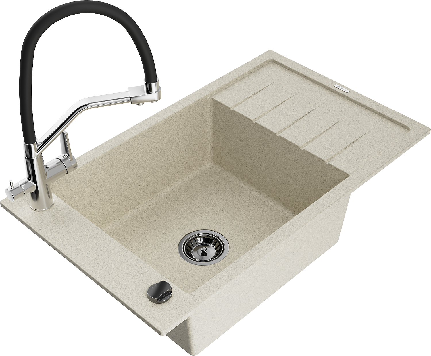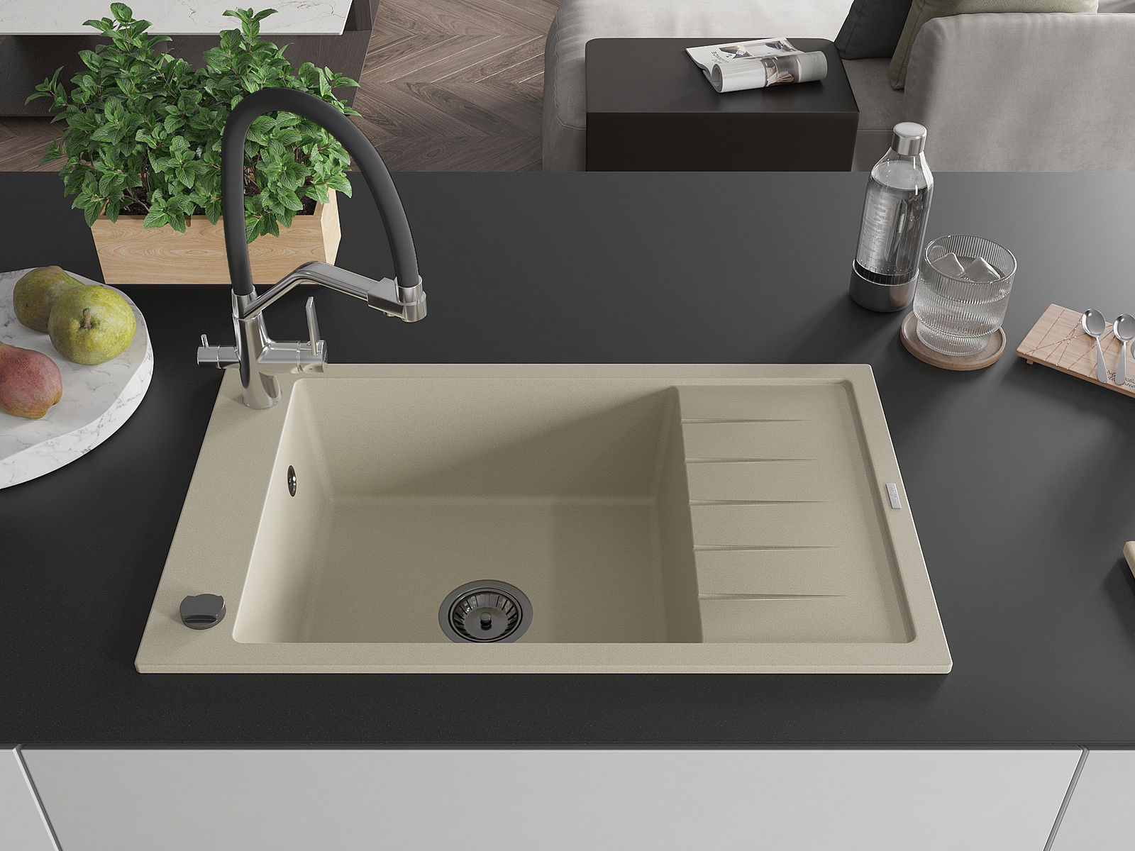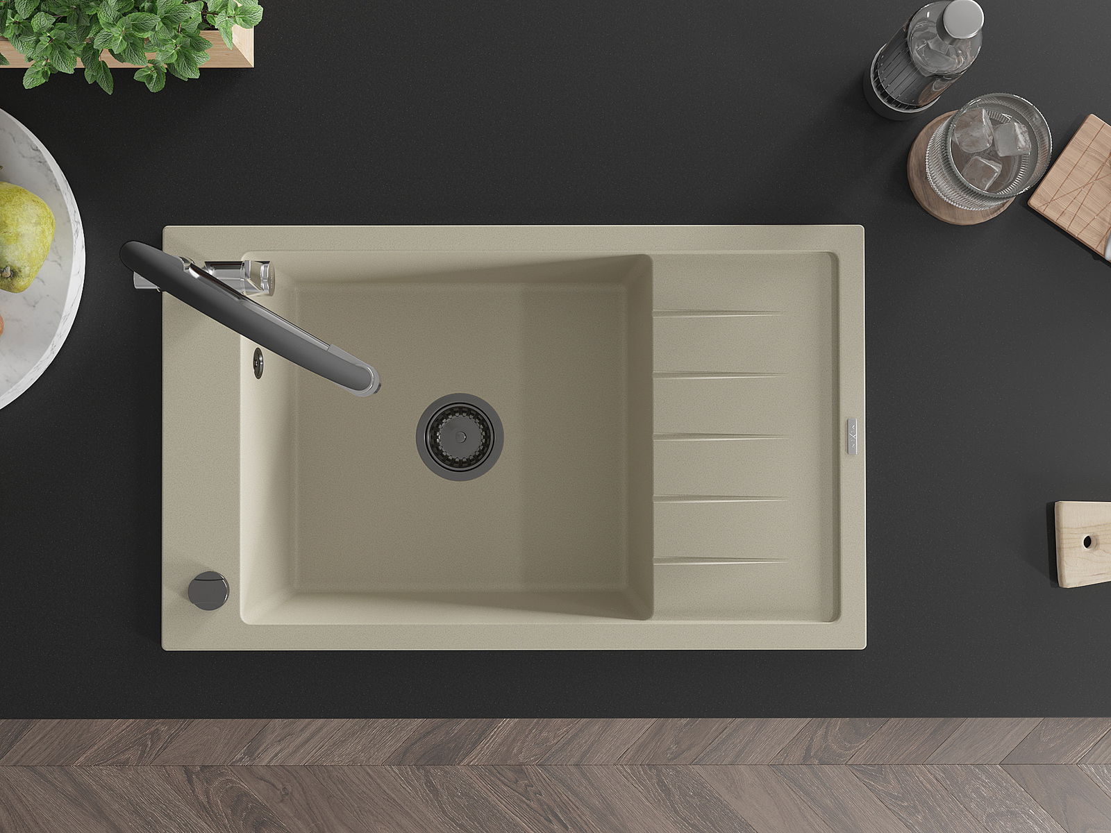 Mexen Elias 1 dubens granitinė virtuvės plautuvė su nusausintuvu ir Duo maišytuvu, smėlio spalvos - 6511-69-671701-07-B