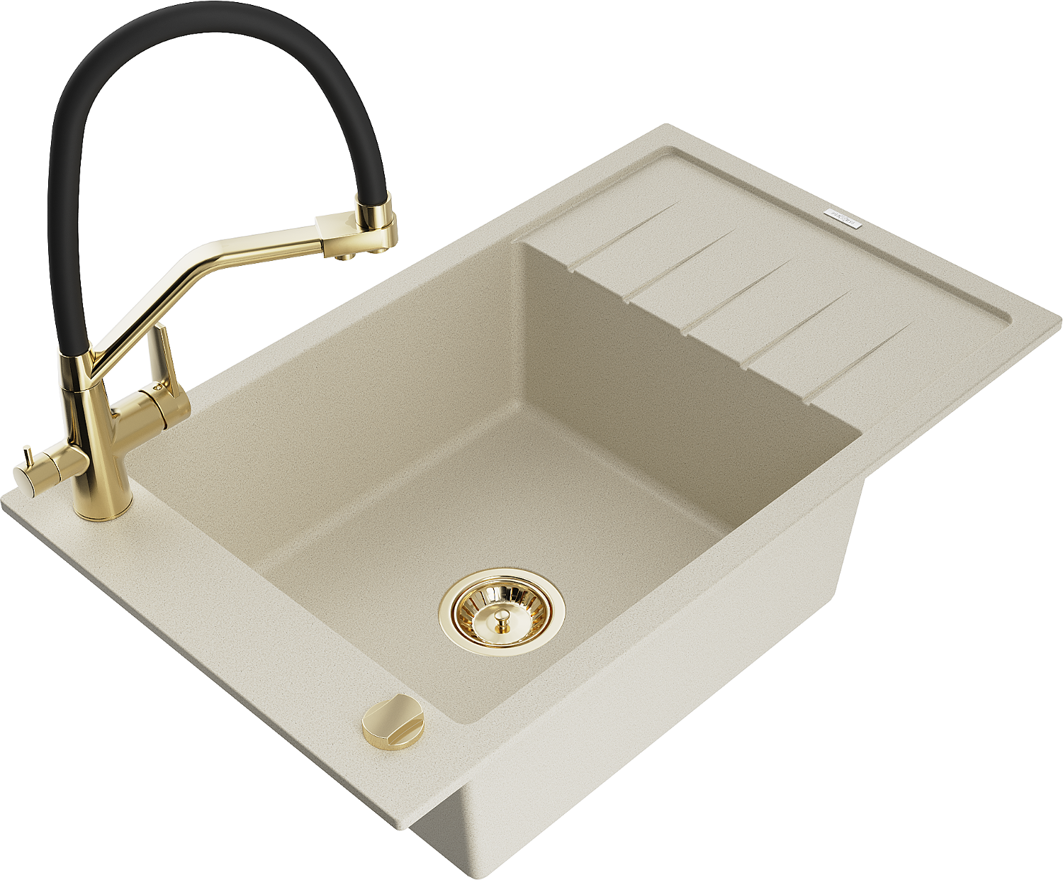 Mexen Elias granitinė vienos kameros kriauklė su nusausintuvu ir virtuviniu maišytuvu Duo, smėlio spalvos - 6511-69-671701-57-G