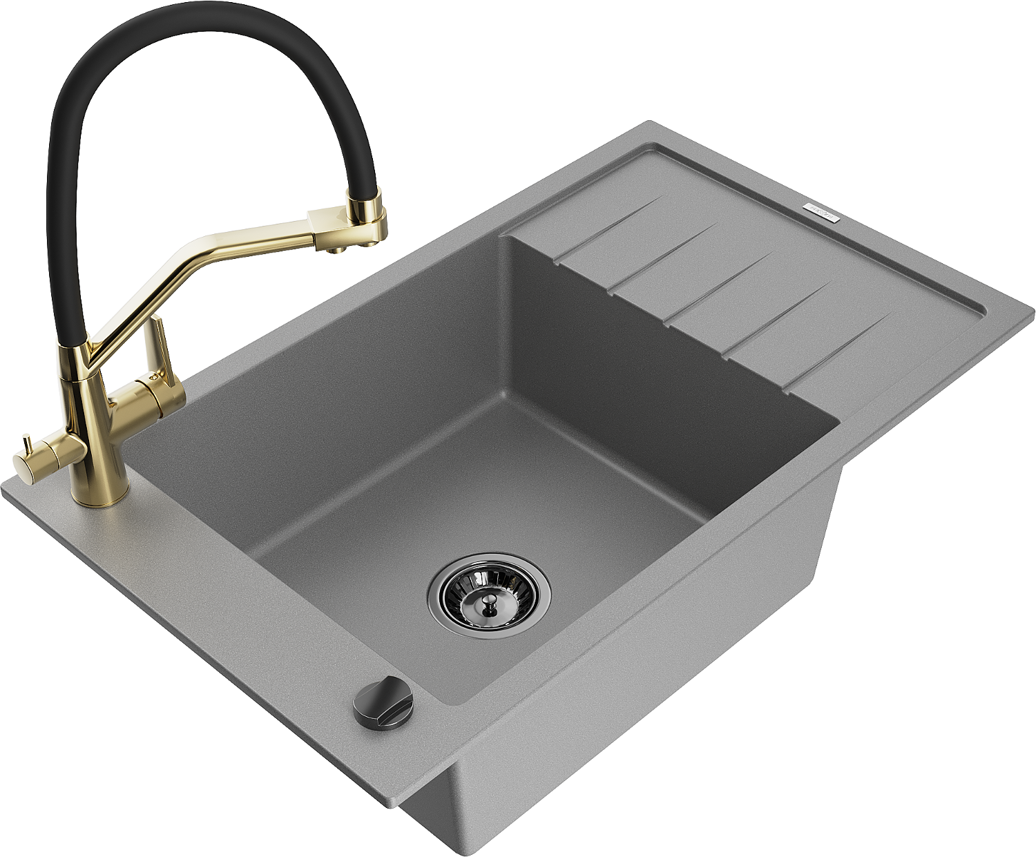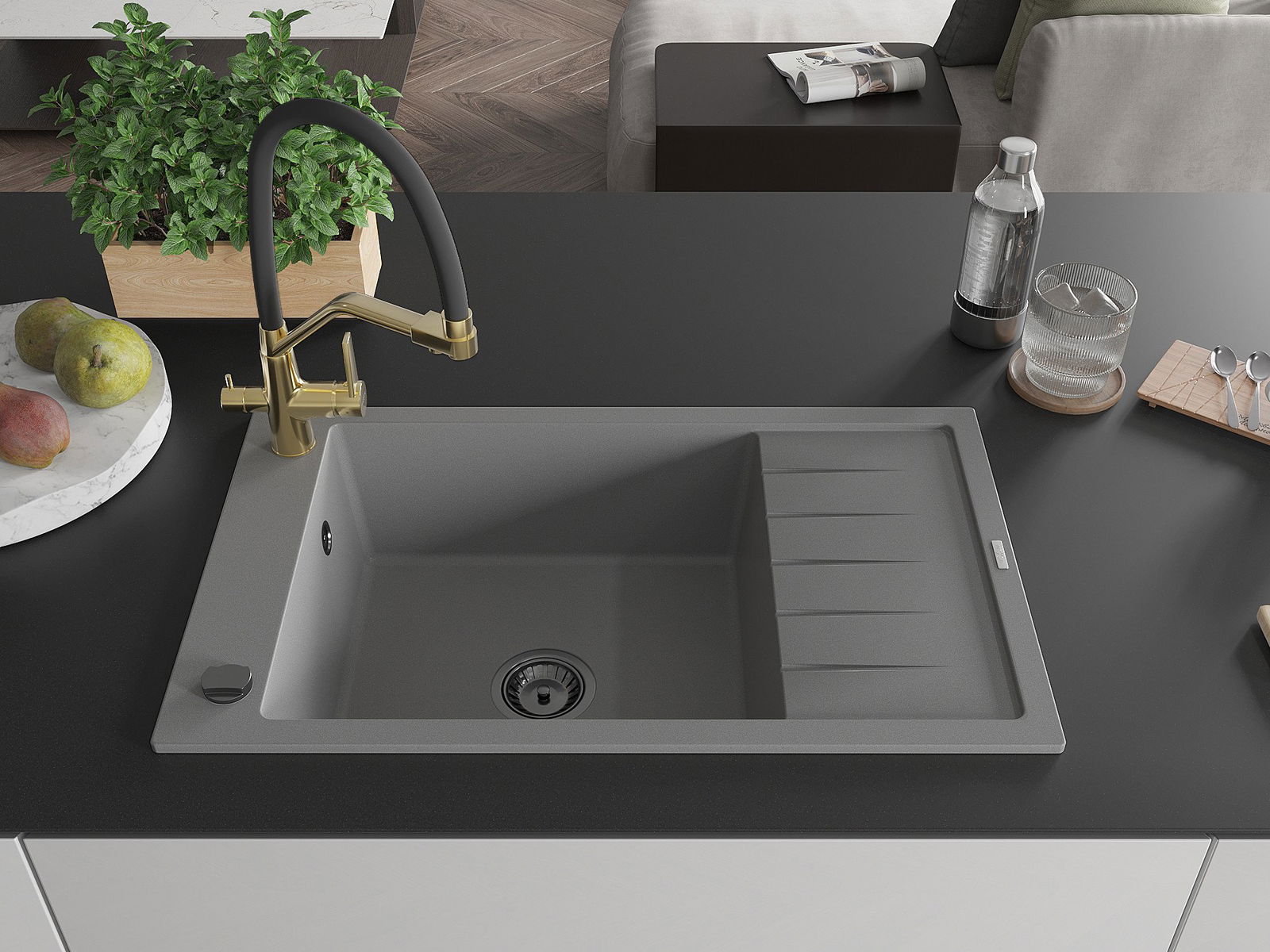 Mexen Elias grindinis granito vienos kameros kriauklė su nutekamąja vieta ir virtuvės maišytuvu Duo, pilka