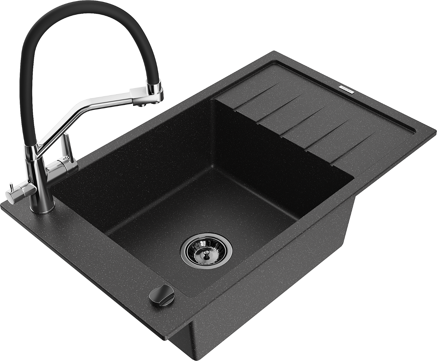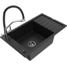Mexen Elias 1-dubens granitinė kriauklė su lašinuku ir virtuvės maišytuvu Duo, juoda/sidabrinė metalo spalva