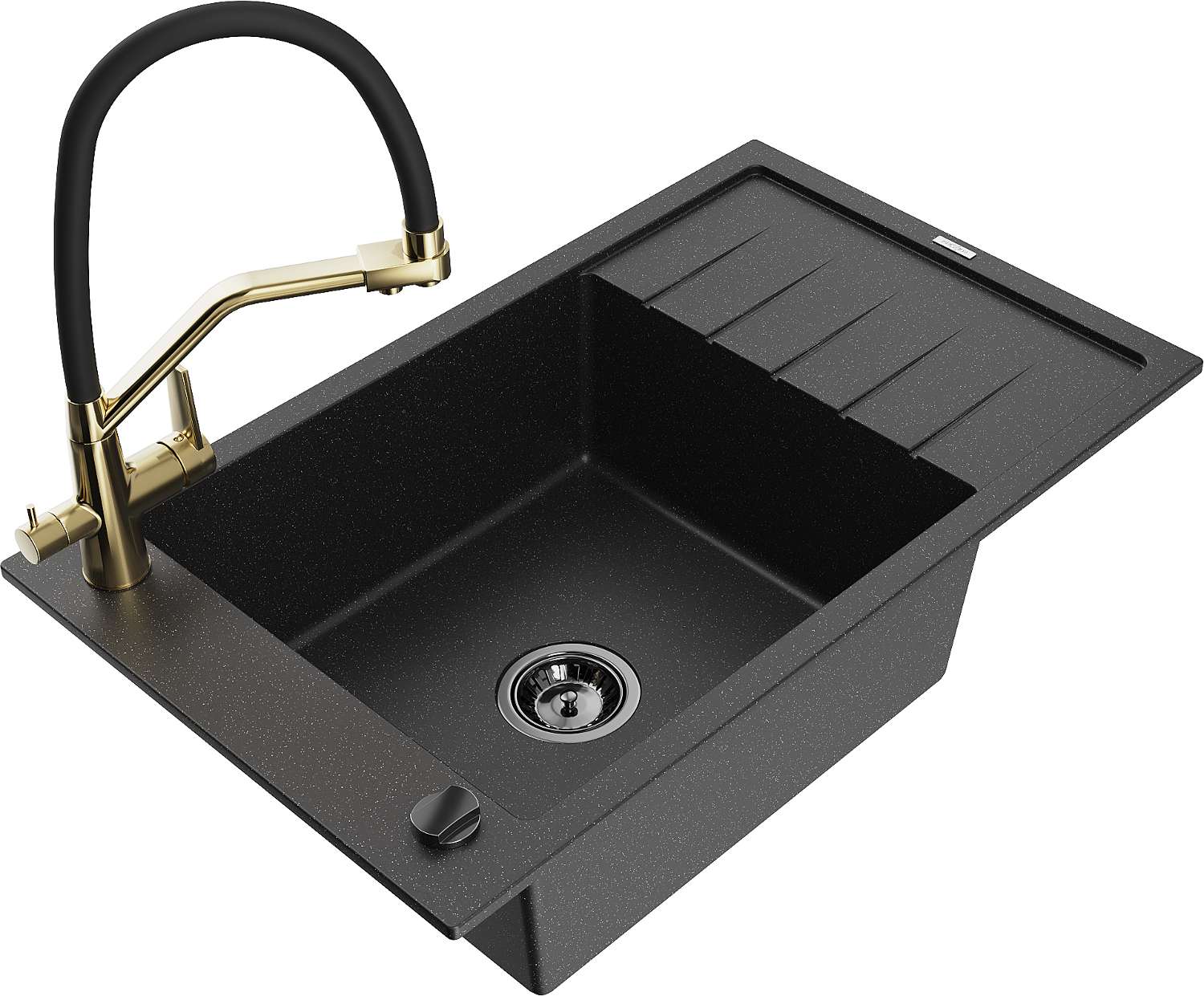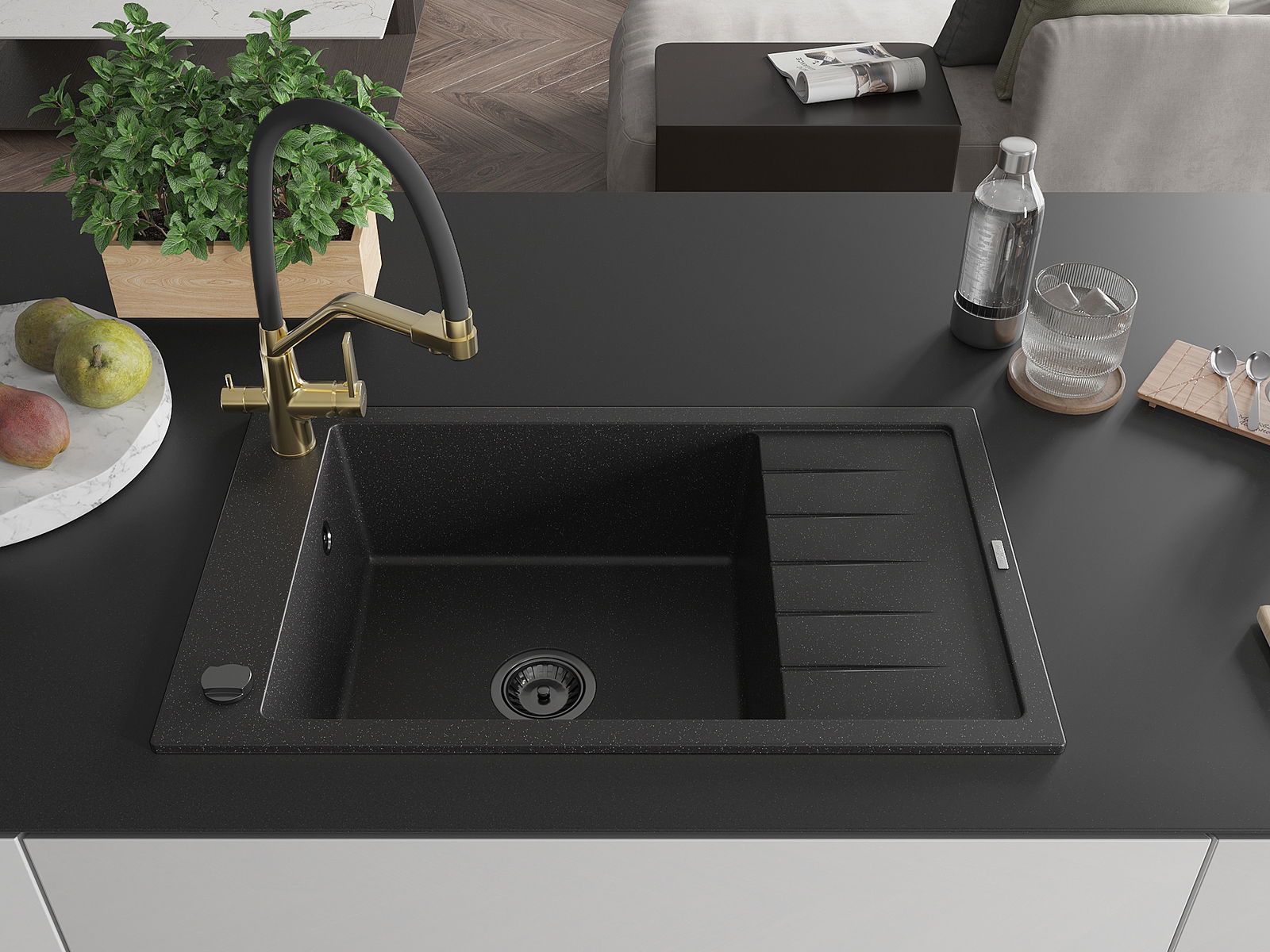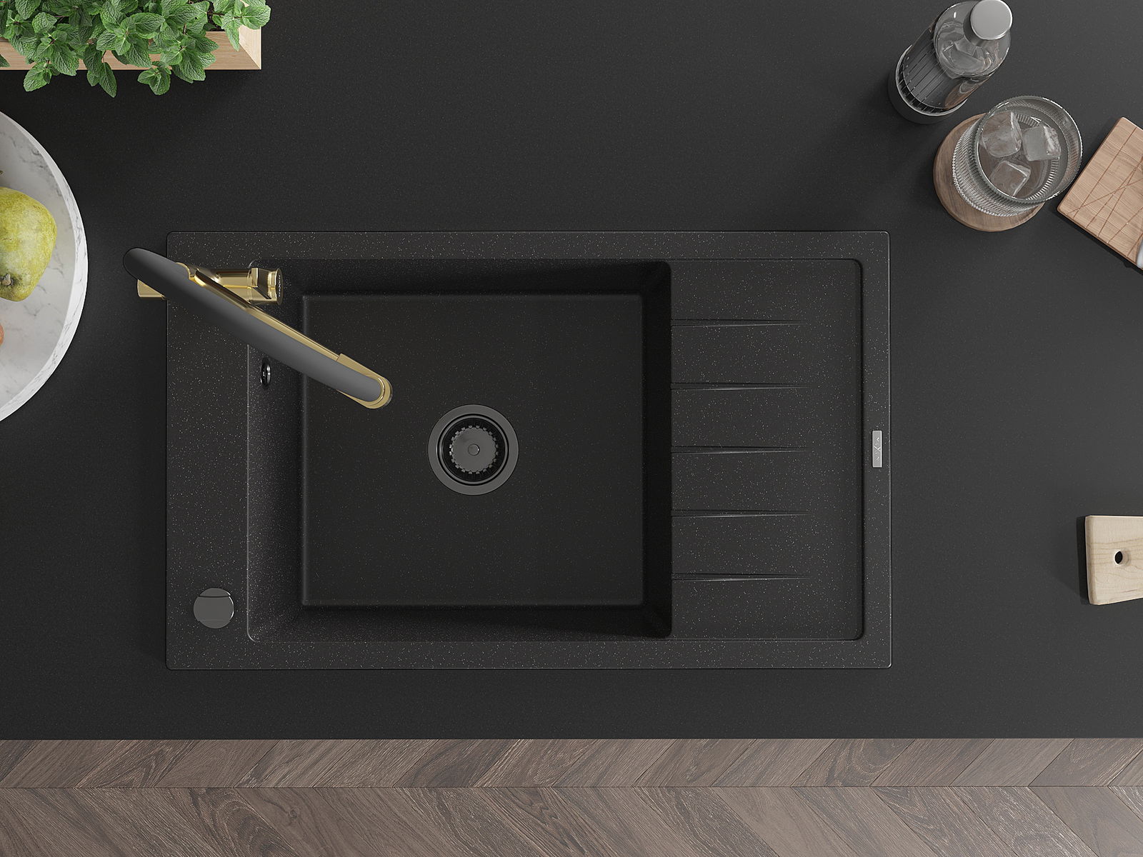 Mexen Elias vienos sekcijos granito plautuvė su nusausintuvu ir Duo virtuvės maišytuvu, juodas/sidabrinis metalikas