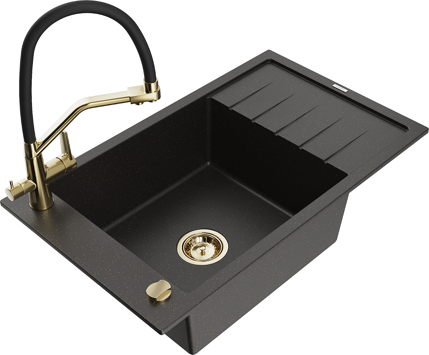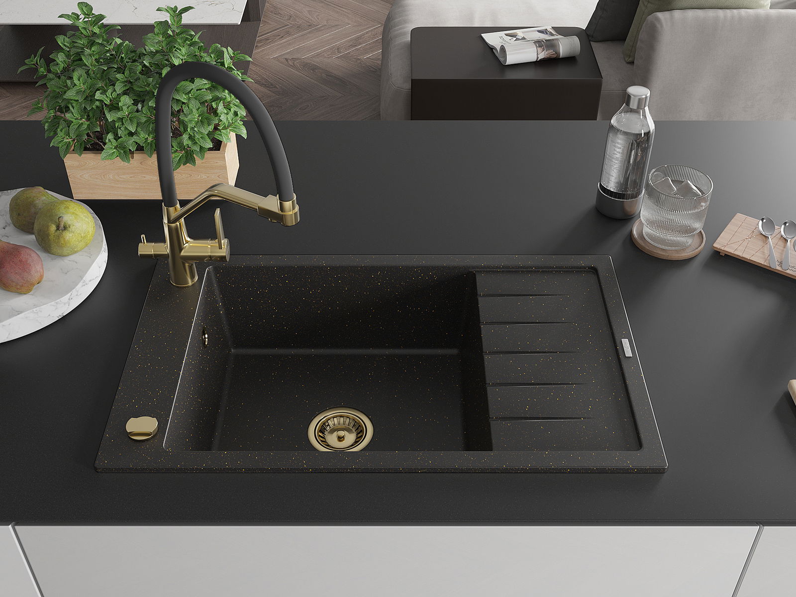 Mexen Elias granitinė vienos kameros plautuvė su nutekamu ir Duo virtuves maišytuvu, juodas/auksinis metalikas