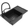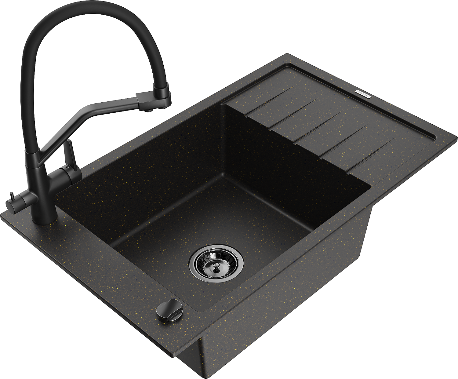 Mexen Elias vieno dubens granitinė kriauklė su nuvarvėjimu ir virtuviniu maišytuvu Duo, juodas/auksinis metalikas