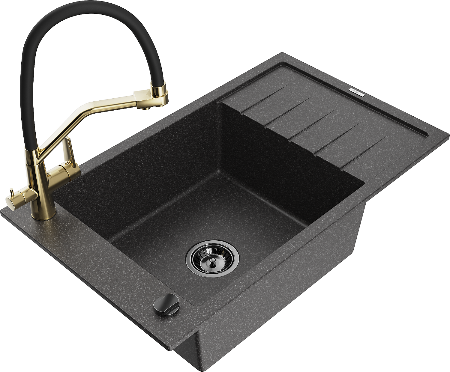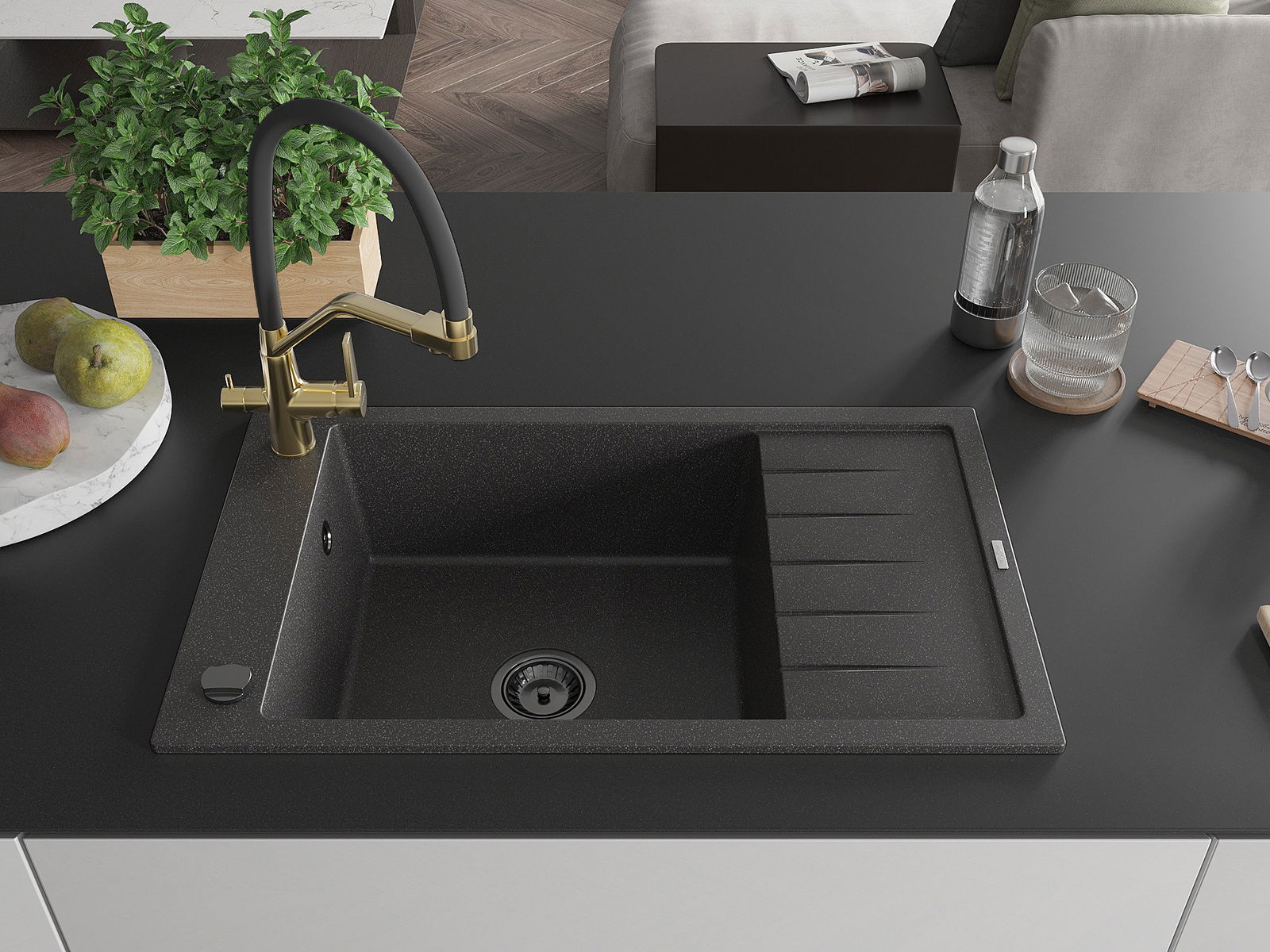 Mexen Elias granitinis kriauklė vienos kameros su nutekamu ir virtuviniu maišytuvu Duo, juoda dėmėta - 6511-76-671701-57-B