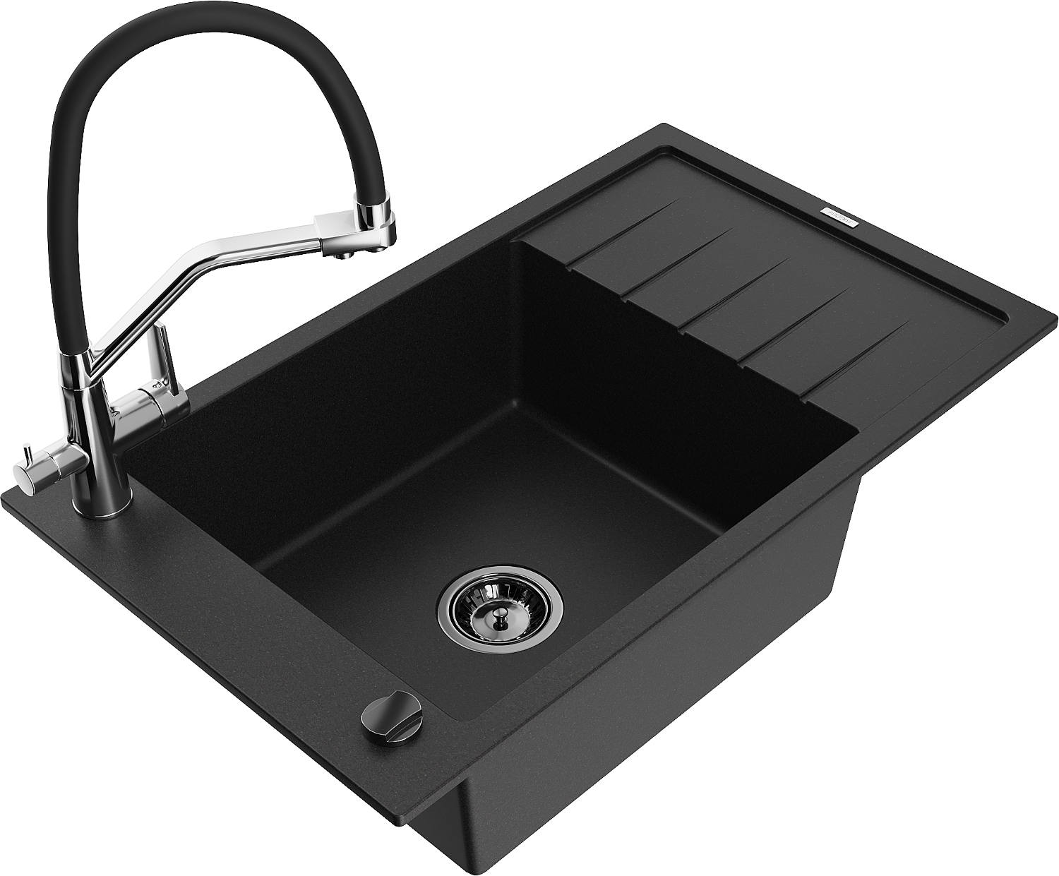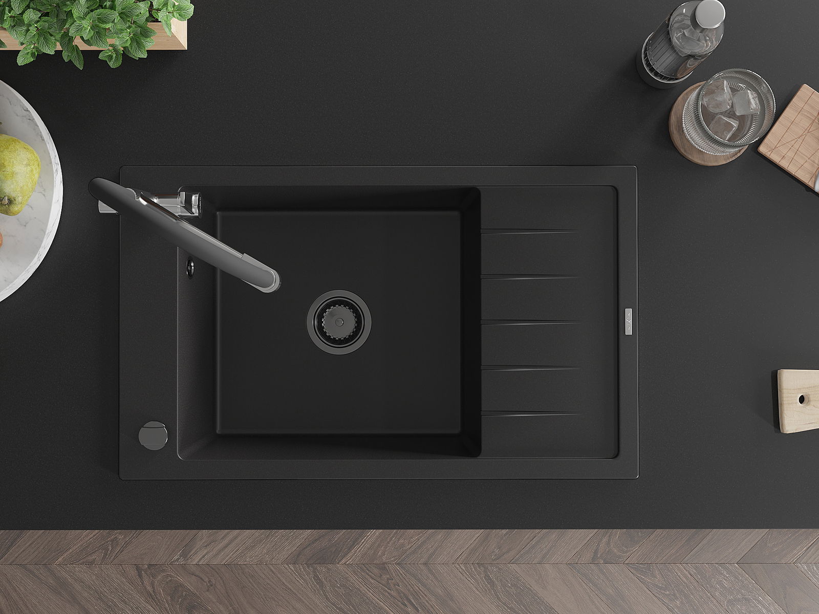 Mexen Elias granitinė vienos kameros kriauklė su nusausintuvu ir virtuviniu maišytuvu Duo, juoda - 6511-77-671701-07-B