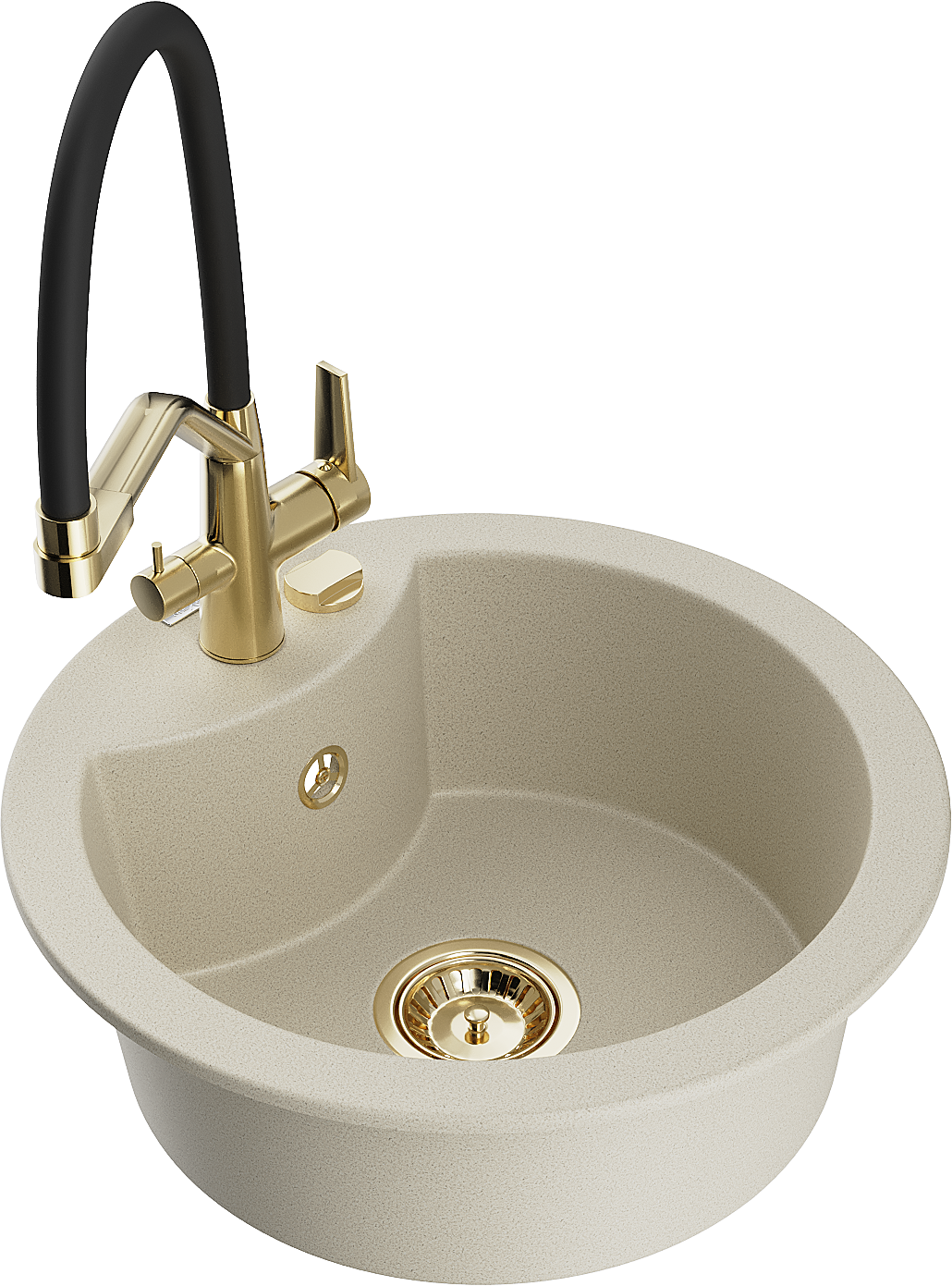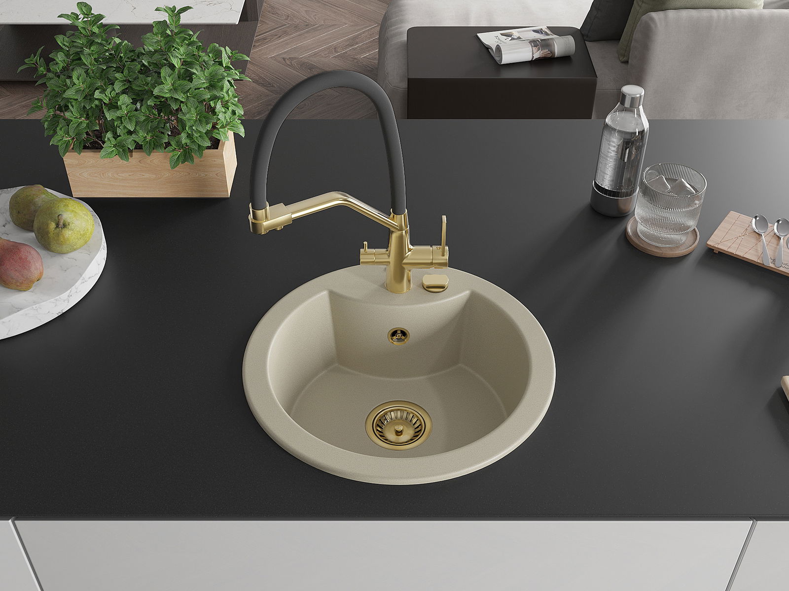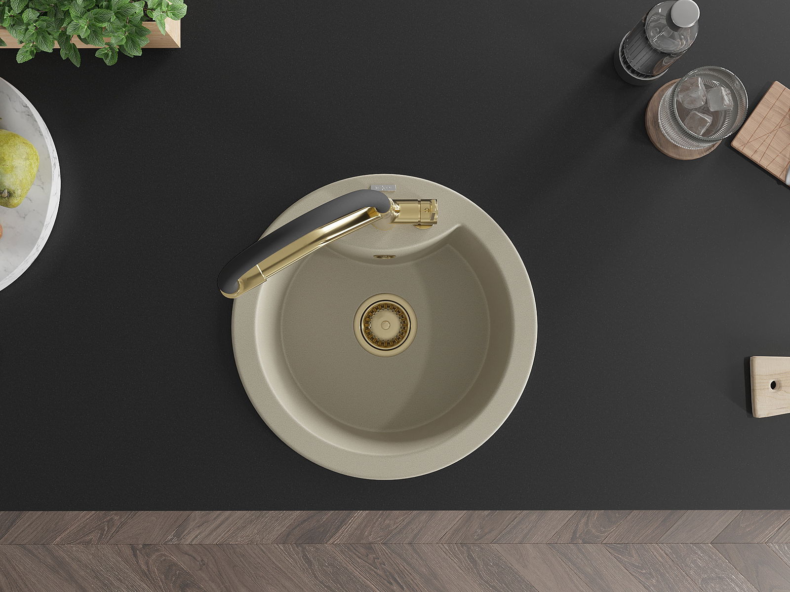 Mexen Diego granitinis vienos sekcijos kriauklė su virtuvės maišytuvu Duo, smėlio spalvos - 6512-69-671701-57-G