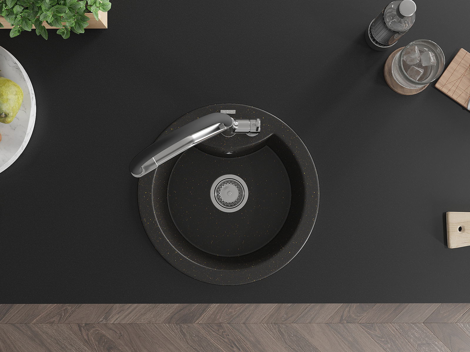 Mexen Diego vienos komoros granito kriauklė su virtuviniu maišytuvu Duo, juoda/aukso metalo spalvos - 6512-75-671701-07