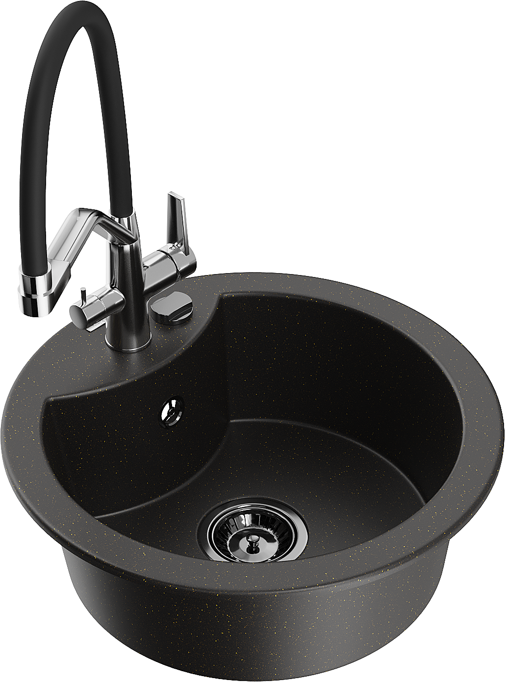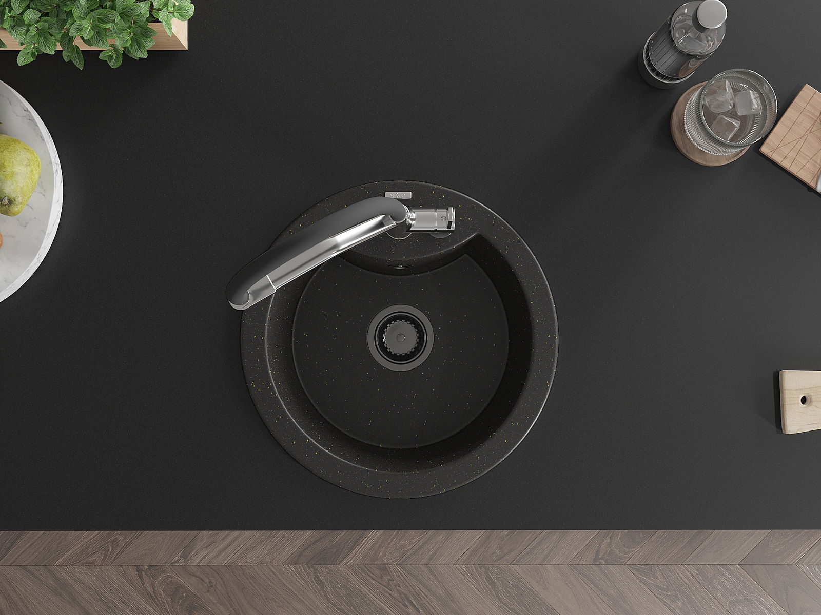 Mexen Diego granito virtuvės kriauklė su 1 kamera ir Duo maišytuvu, juoda/auksinis metalikas - 6512-75-671701-07-B