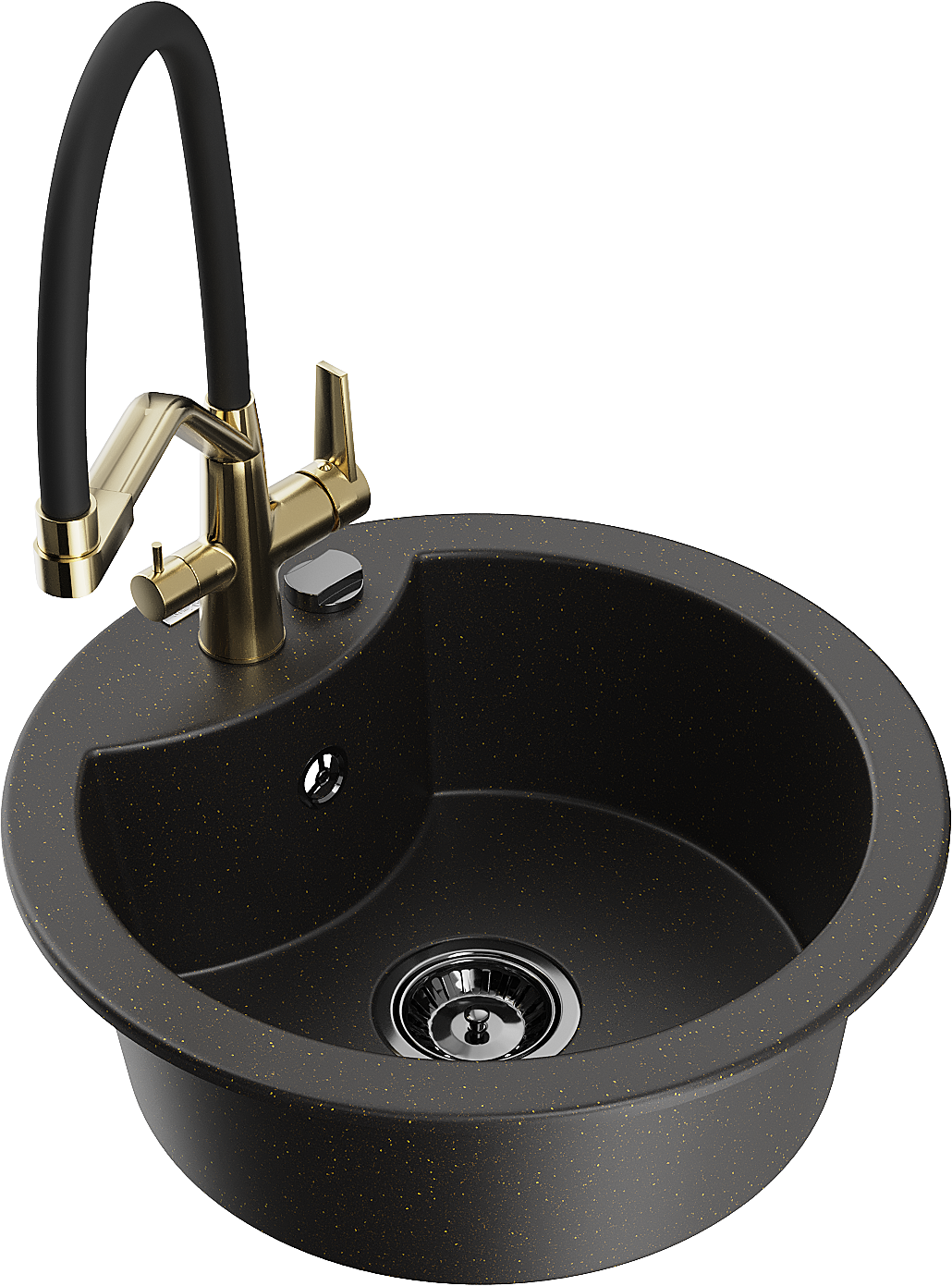 Mexen Diego granitinė vienos kameros kriauklė su virtuviniu maišytuvu Duo, juoda/auksinė metalo spalva - 6512-75-671701-57-B