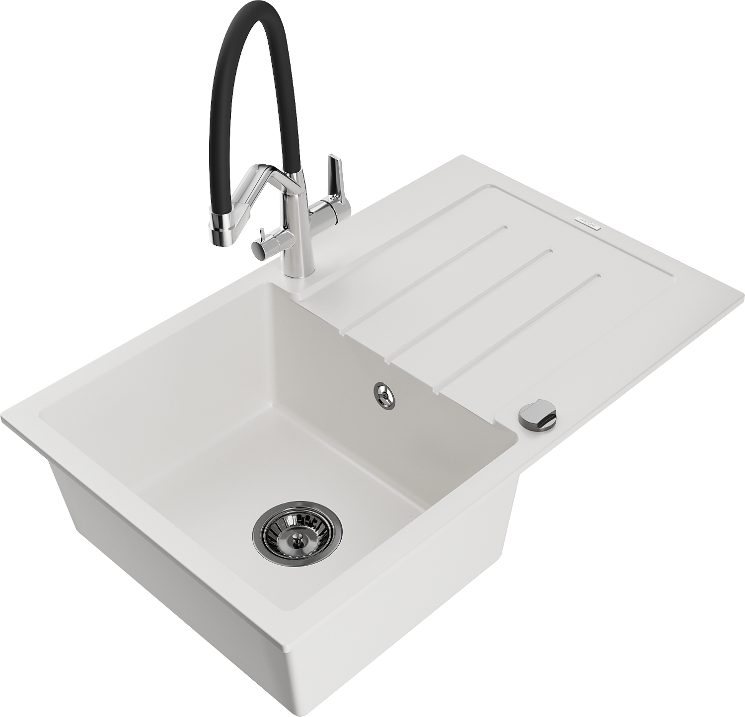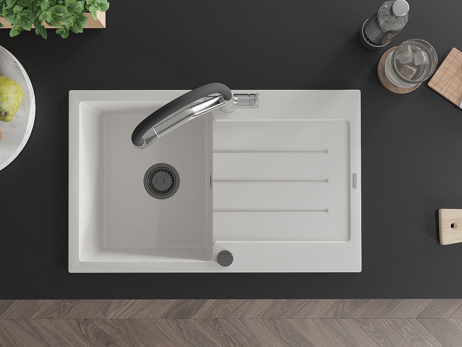 Mexen Bruno vienaaukštis granito kriauklė su nusausinimo lenta ir virtuvės maišytuvu Duo, balta - 6513-20-671701-07-B