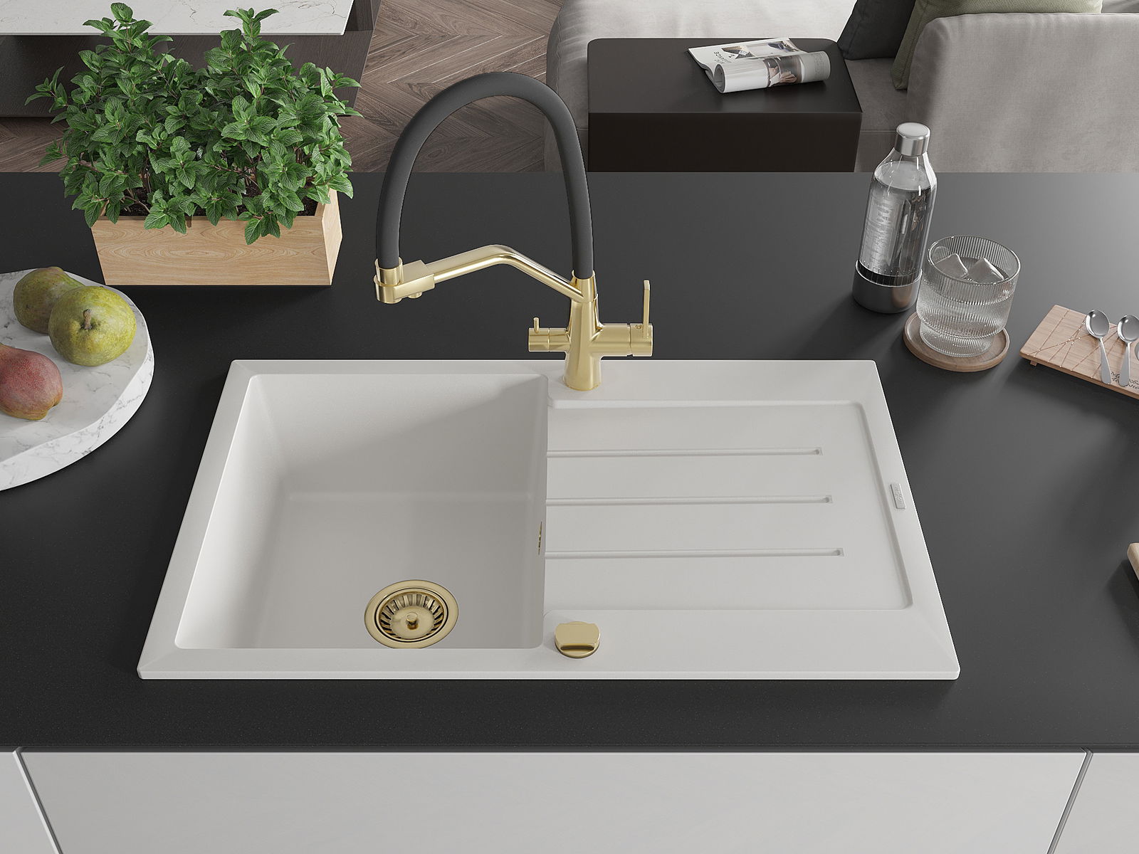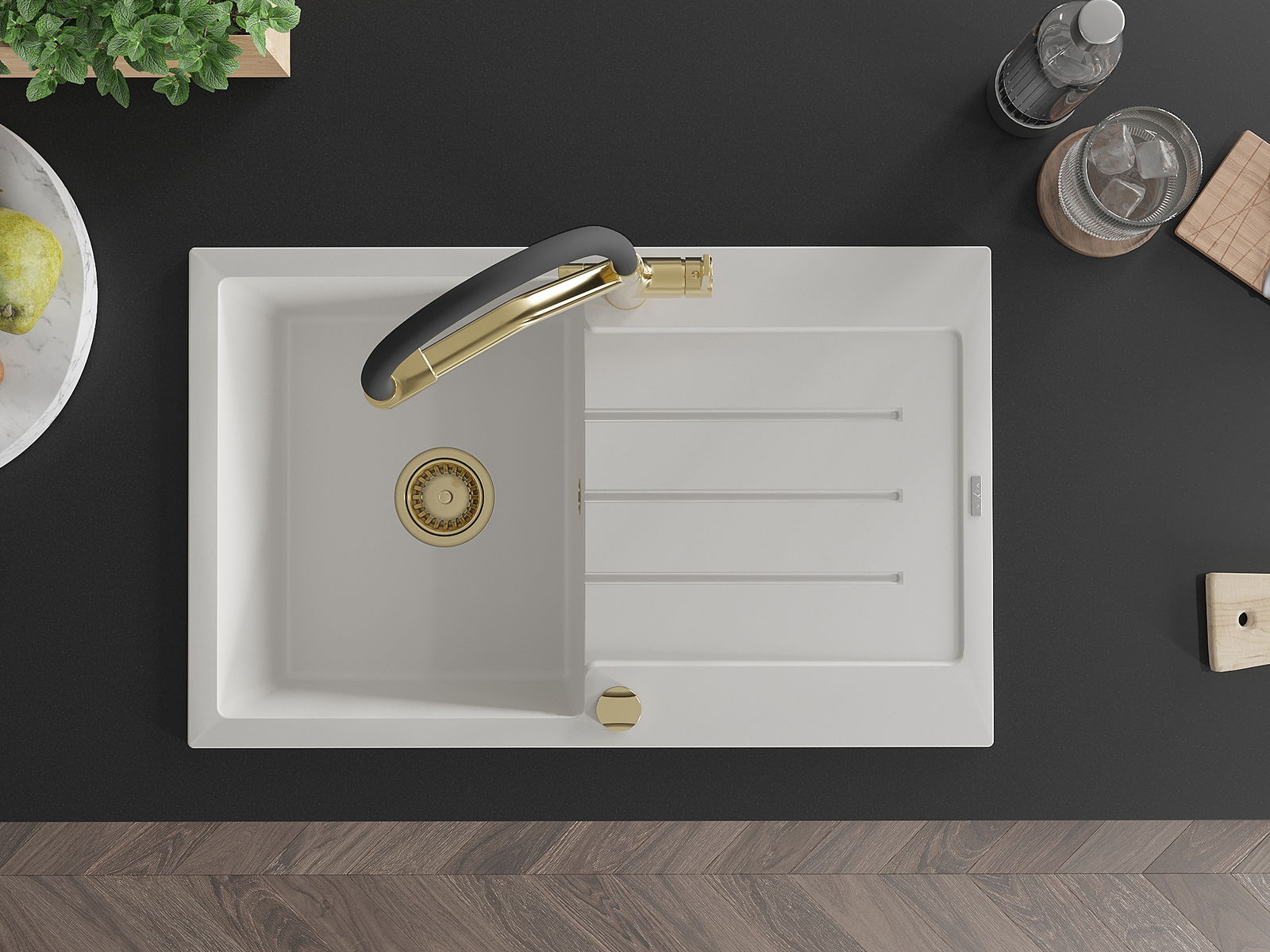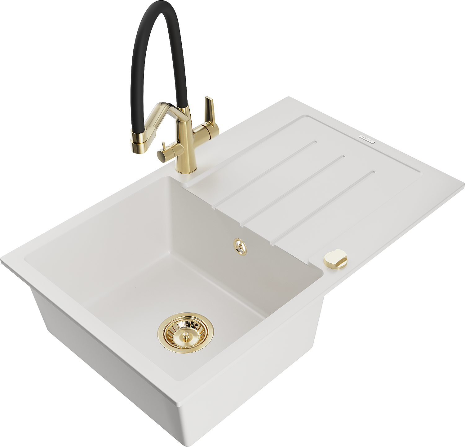 Mexen Bruno granitinė vieno dubens kriauklė su nuotėkiu ir virtuviniu maišytuvu Duo, balta - 6513-20-671701-57-G