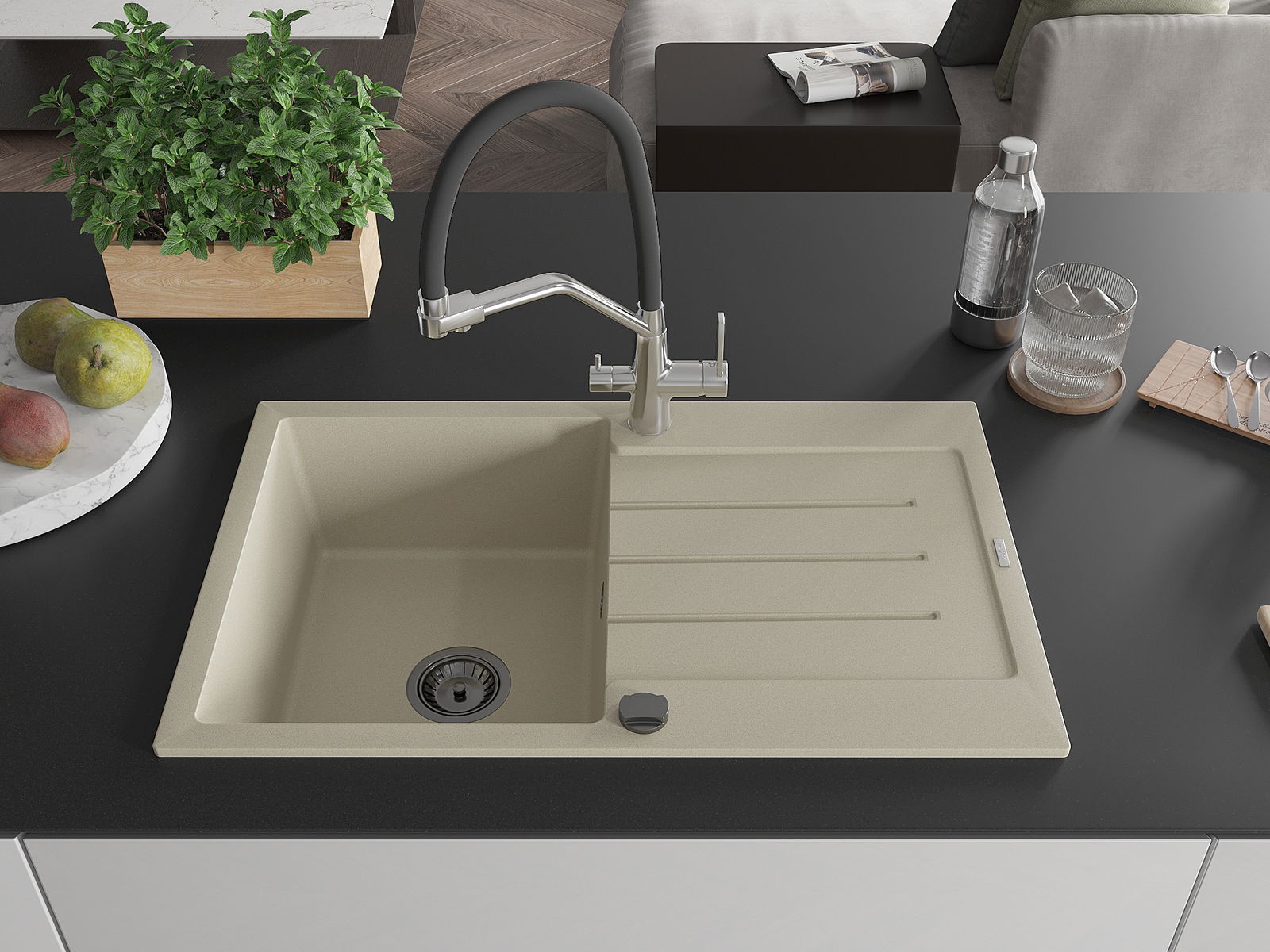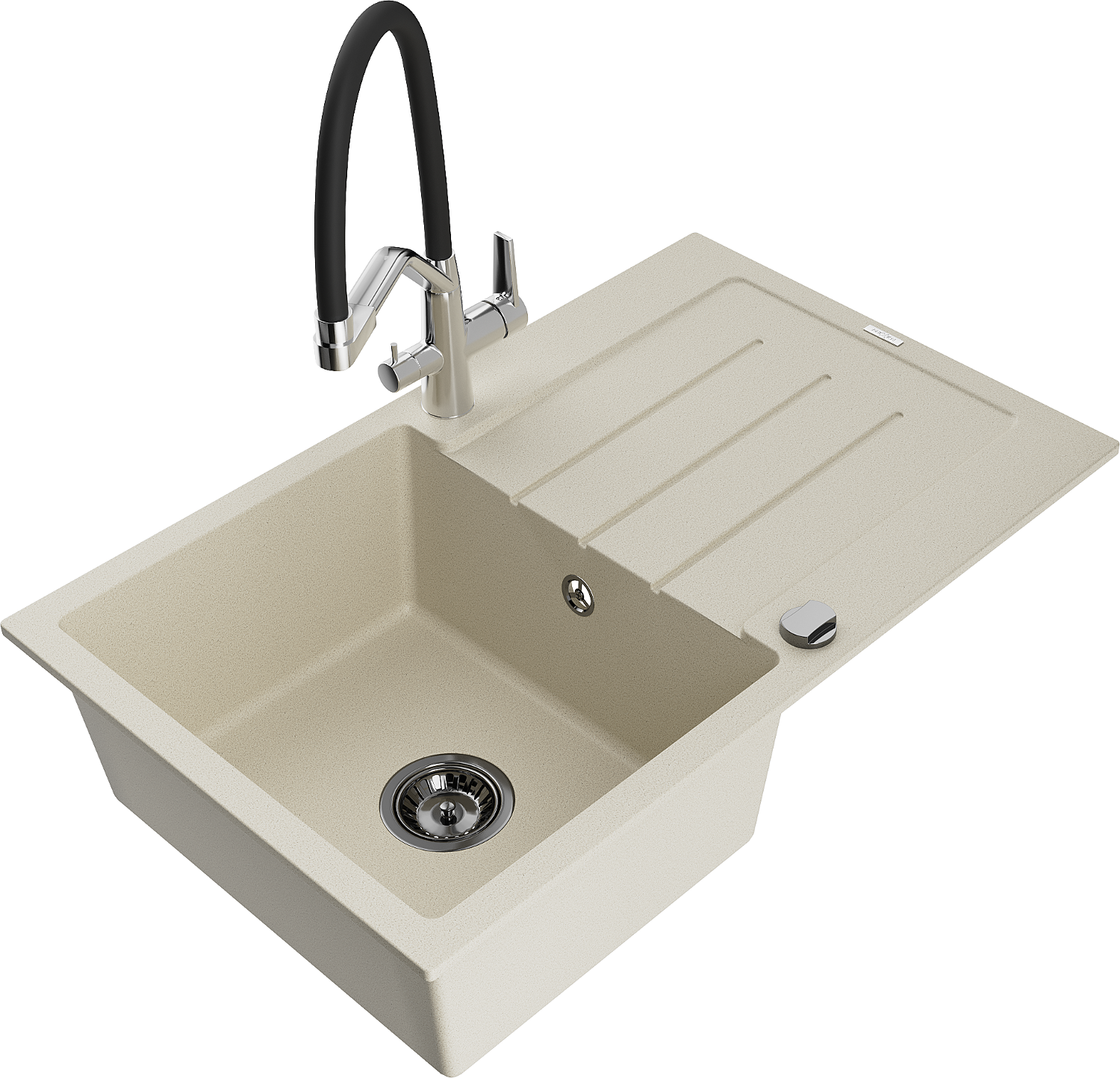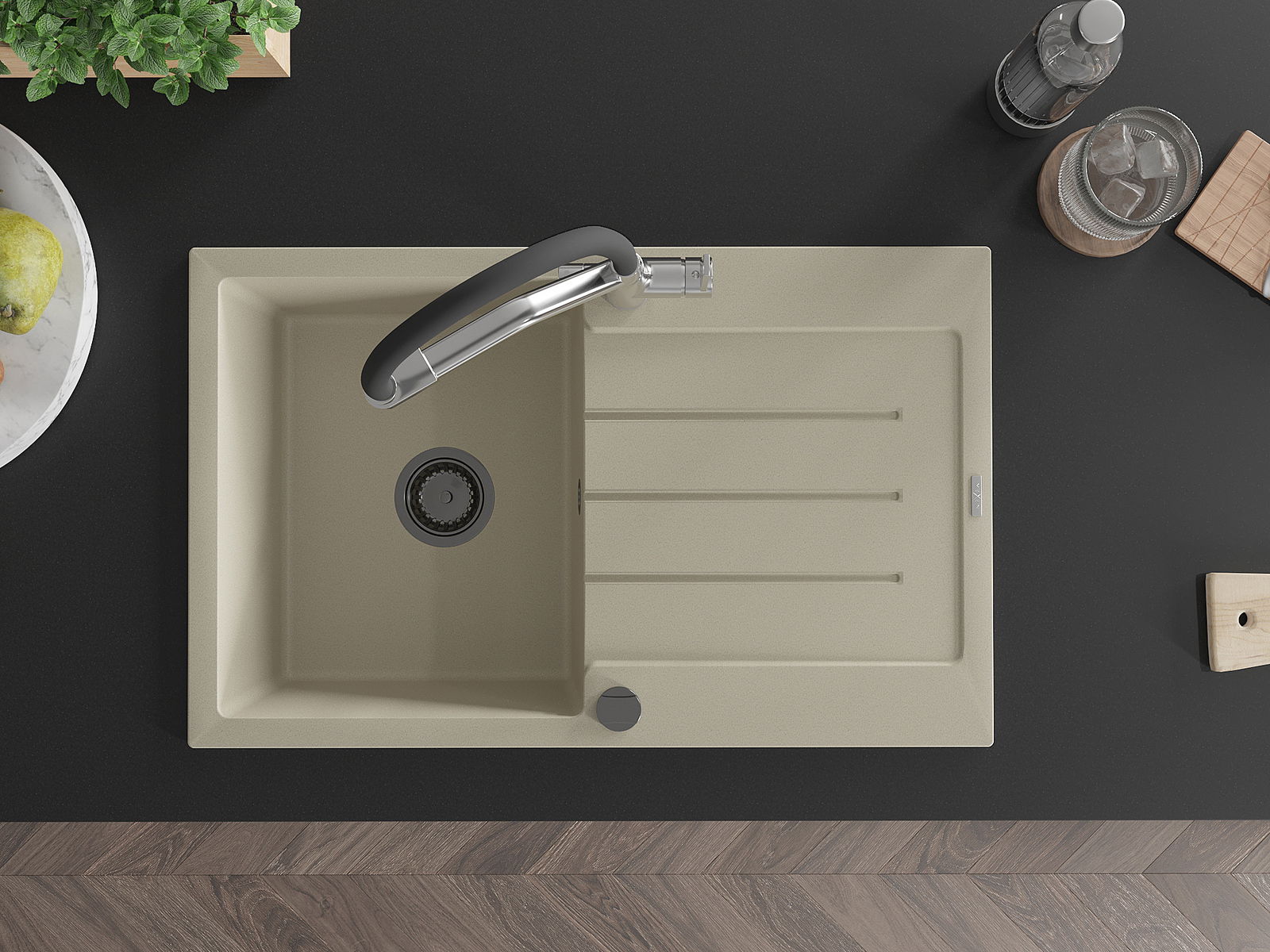 Mexen Bruno granitinė vienos kameros kriauklė su nusausintuvu ir Duo virtuviniu maišytuvu, smėlio spalvos