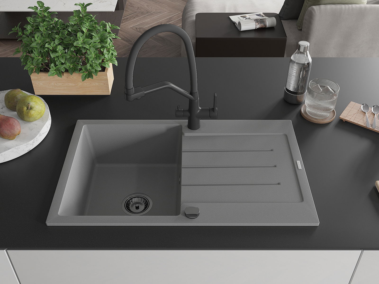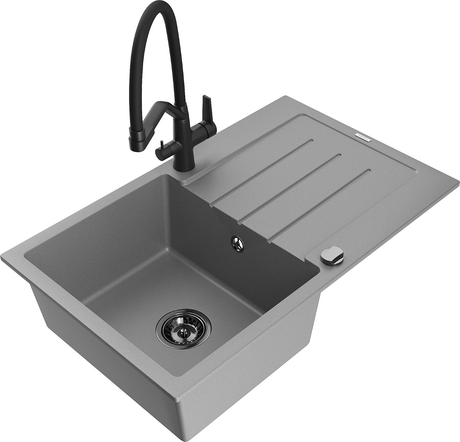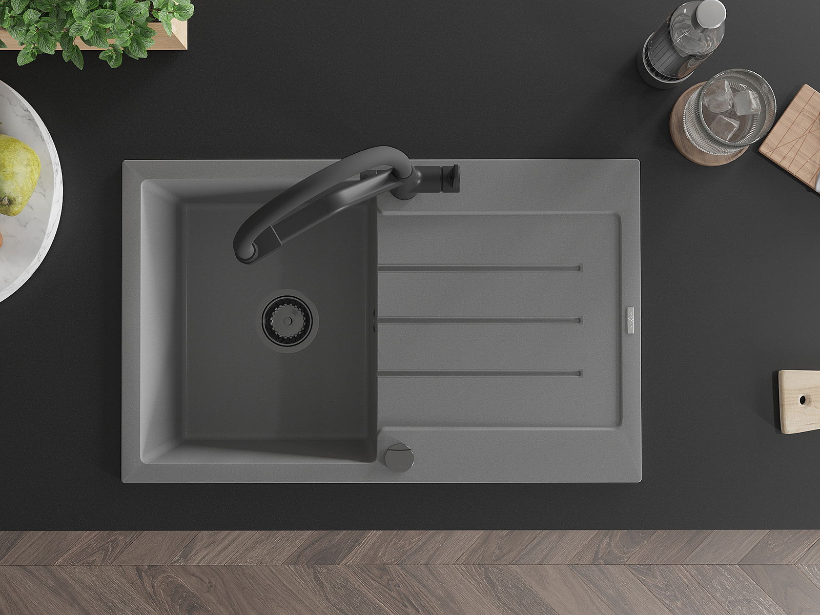 Mexen Bruno granitinė virtuvės plautuvė su vienu dubeniu, nusausinimo zona ir virtuviniu maišytuvu Duo, pilka