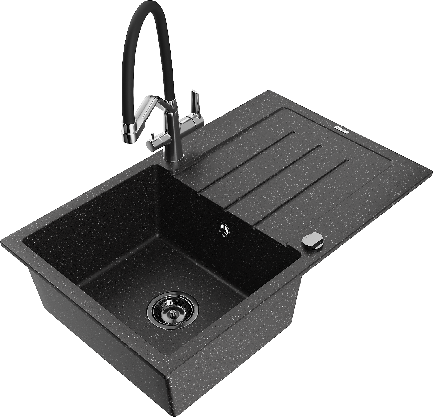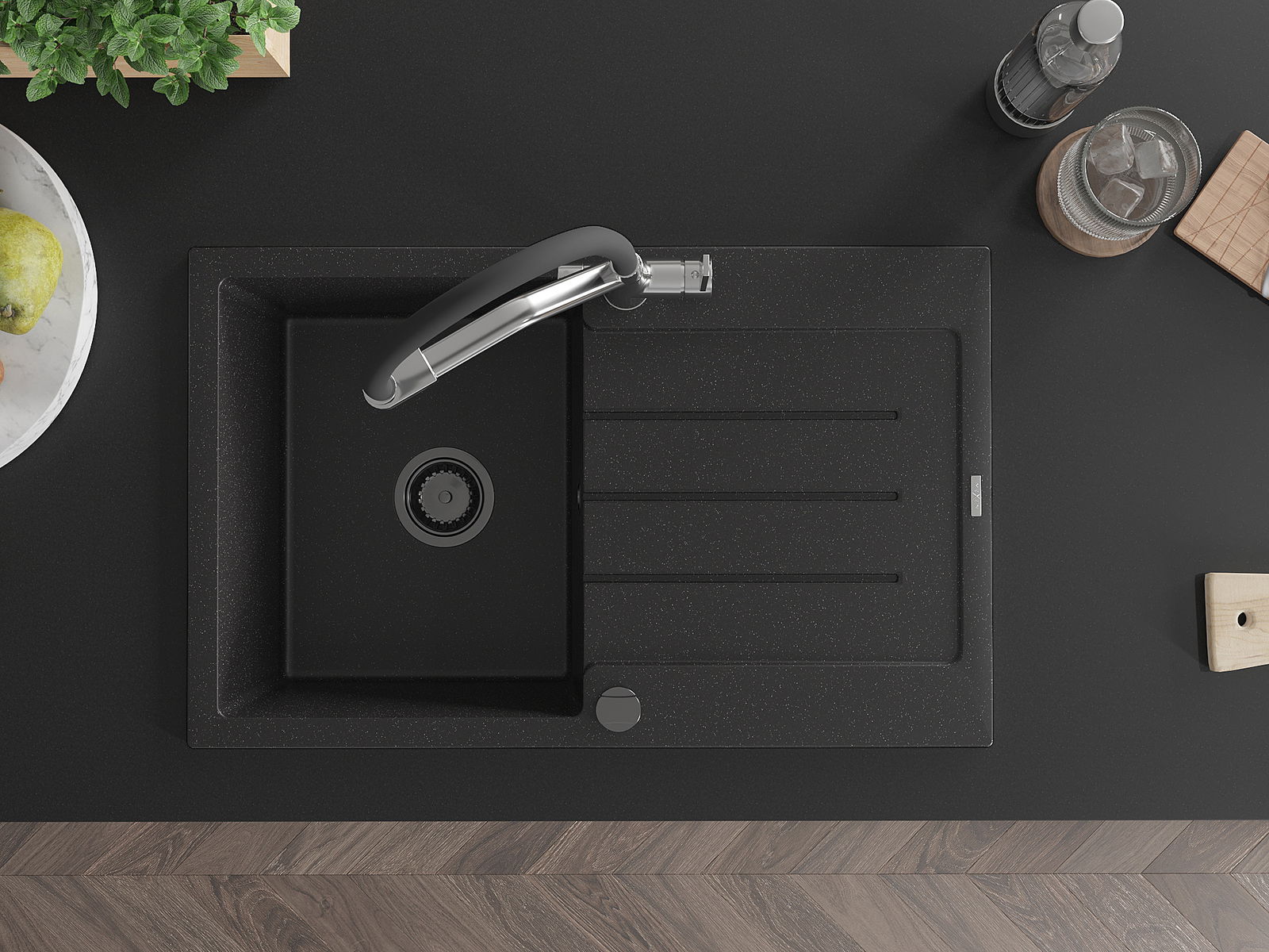 Mexen Bruno granitinė vienos kameros plautuvė su nusausinimo stelažu ir virtuviniu maišytuvu Duo, juodos/sidabrinės metalo