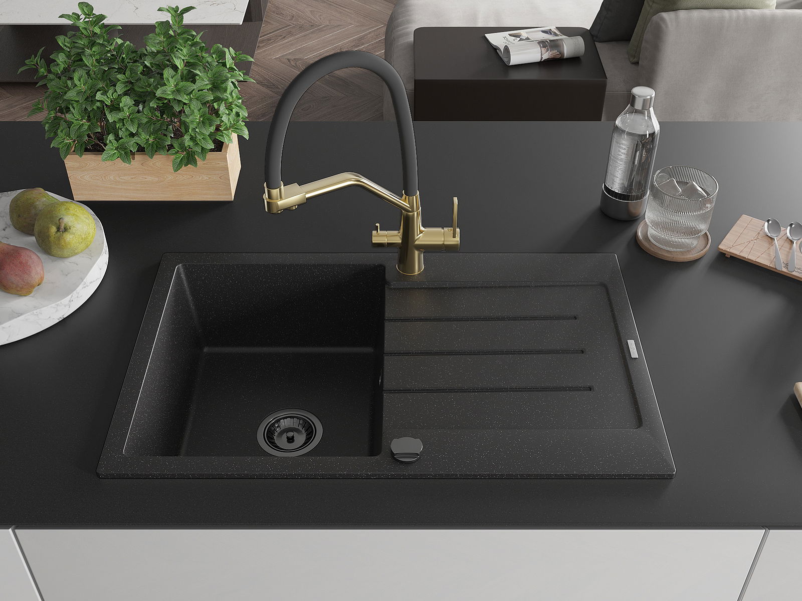 Mexen Bruno granitinė vienos plautuvės kriauklė su nusausintuvu ir virtuviniu maišytuvu Duo, juoda/sidabrinė metalika