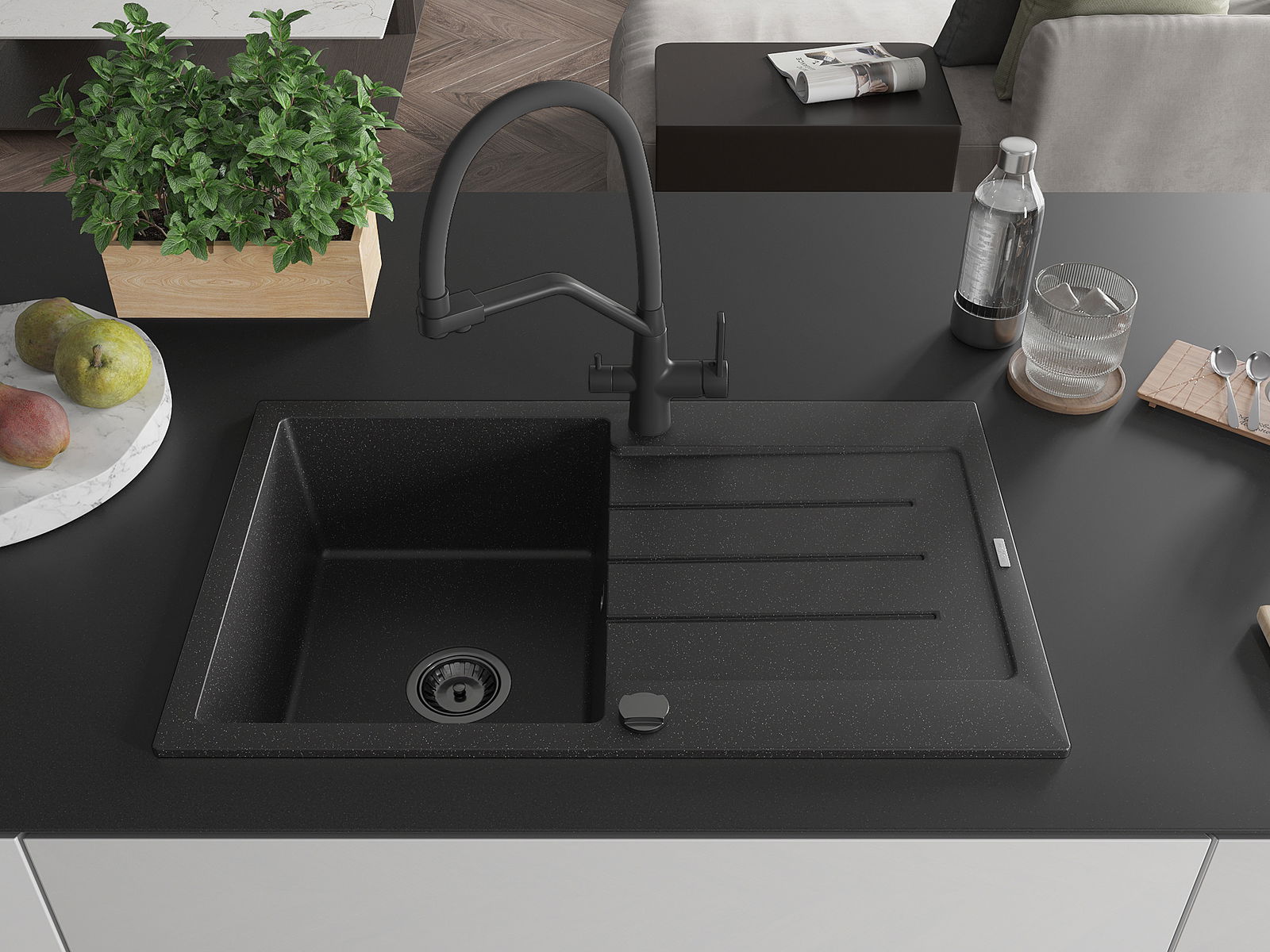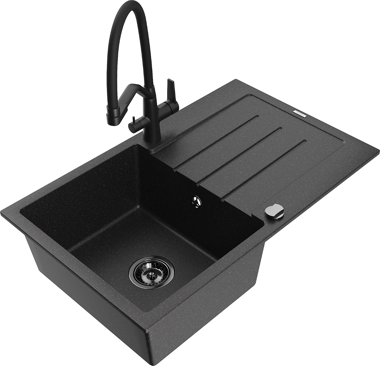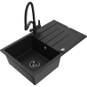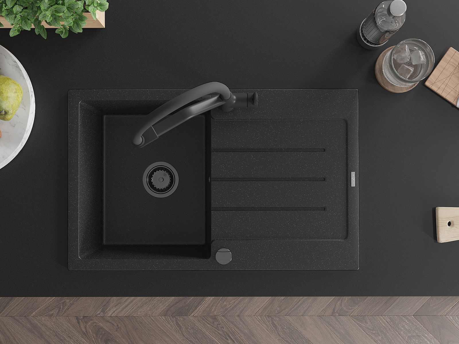 Mexen Bruno granitinė vienos kameros kriauklė su nutekėjimu ir Duo virtuviniu maišytuvu, juodos/sidabrinės metalo spalvos